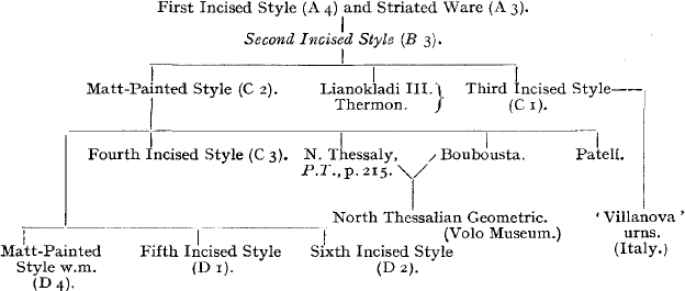 page 58 note 1 The Lianokladi Geometric probably derives directly from the Second Incised Style (B 3) rather than from the Painted (C 2), to which it is parallel. A suggested genealogy of the Second Incised Style is set out in the following diagram.