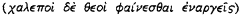 where it is suggested that the gods appear in their recognisable divine figures: P. Pucci (above, n.14) 111 n.3. In other cases, however, in the Odyssey, the expression phainesthai enarges means ‘becomes visible’ rather than in an ‘undisguised form’ (ibid. 110 ff.: ch. 9 ‘More Light in the Epiphany, Less Light in the Text’). Pucci suggests that the word enargts in divine epiphanies has not always the same but contradictory meanings: ‘… In its five occurrences in Homer, the word always refers to a divine presence (II. 20.131; Od. 3.420, 7.201, 16.161) or to a divinely inspired and transmitted dream (Od. 4.481)’: 110 n. 1 and 111 n.4 (for the various meanings of enarges in divine epiphanies). See also Anastasiou, I., ![]()