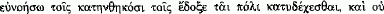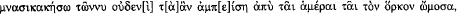 25 Lines 57-61: τάδε συνέθεντο καί ώμοσαν οί στρατηγοί οί 'Αθηναίων πρός τάς πόλες τ[ά]ςέν Κέωι κα[ί] οί σύμμαχοι· vacat ό μνηαικακήσω [τŵ]ν πα[ρ]εληλυθότων πρό[ς] Κείος ούδ[ε]νός ούδέ άποκτενŵ Κ[είων] ό[δ]ένα ούδέ φυγάδα ποήσω τŵν έμμενόντων τοĩςőρκο[ις καί τ]αĩς συνθήκαις ταĩσδε,… Notice the framing of the chiasmus in the wording of the oath: συνέθεντο καί ώμοσαν and τοĩς όρκο[ις καί τ]αĩς συνθήκαις discussed in the note below.