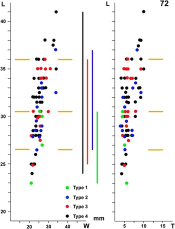 Fig 11 Length/width (left) and length/thickness (right) diagrams of the seventy-two complete gunflints. The colours indicate the four different classes (1 to 4) into which they have been subdivided. The vertical lines represent the maximum and minimum dimensions of the different classes throughout the assemblage. Drawing: P Biagi