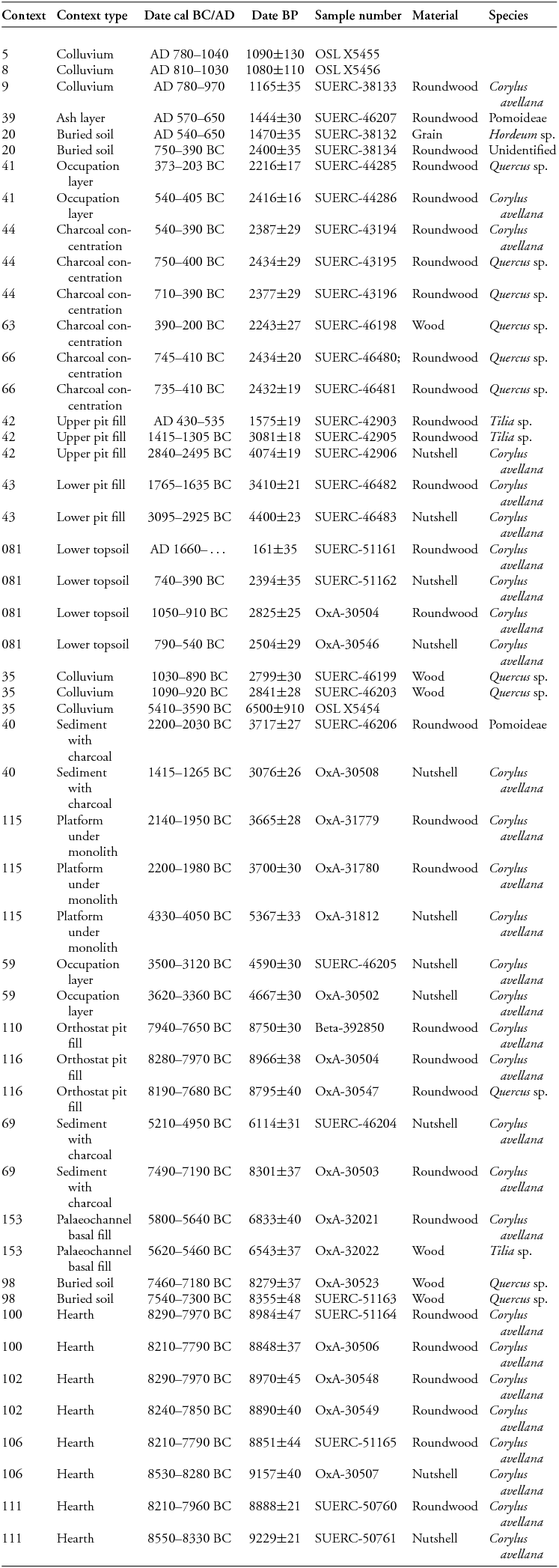Four Early Mesolithic hearths were set sequentially within the top of a large, humanly dug pit. Eight dates on carbonised hazelnut shell and roundwood from these hearths show little stratigraphic consistency but range between 8550–8330 cal BC (SUERC-50761; 9229±21 BP), and 8220–7790 cal BC (SUERC-51165; 8851±44 BP) at 95.4% probability (Figure 7; Table 1). The hearths were incorporated within the A horizon of a buried soil (098) containing oak charcoal that dated to 7490–7190 cal BC at 95.4% probability (combine of OxA-30523 and SUERC-51163). Another date for Mesolithic activity comes from a carbonised hazelnut shell in layer 069 at the northern tip of the outcrop: 5210–4947 cal BC (SUERC-46204; 6114±31 BP). The only artefact from the sequence of hearths was a tiny flint flake. There was no evidence of any Mesolithic quarrying or working of rhyolite from the outcrop.