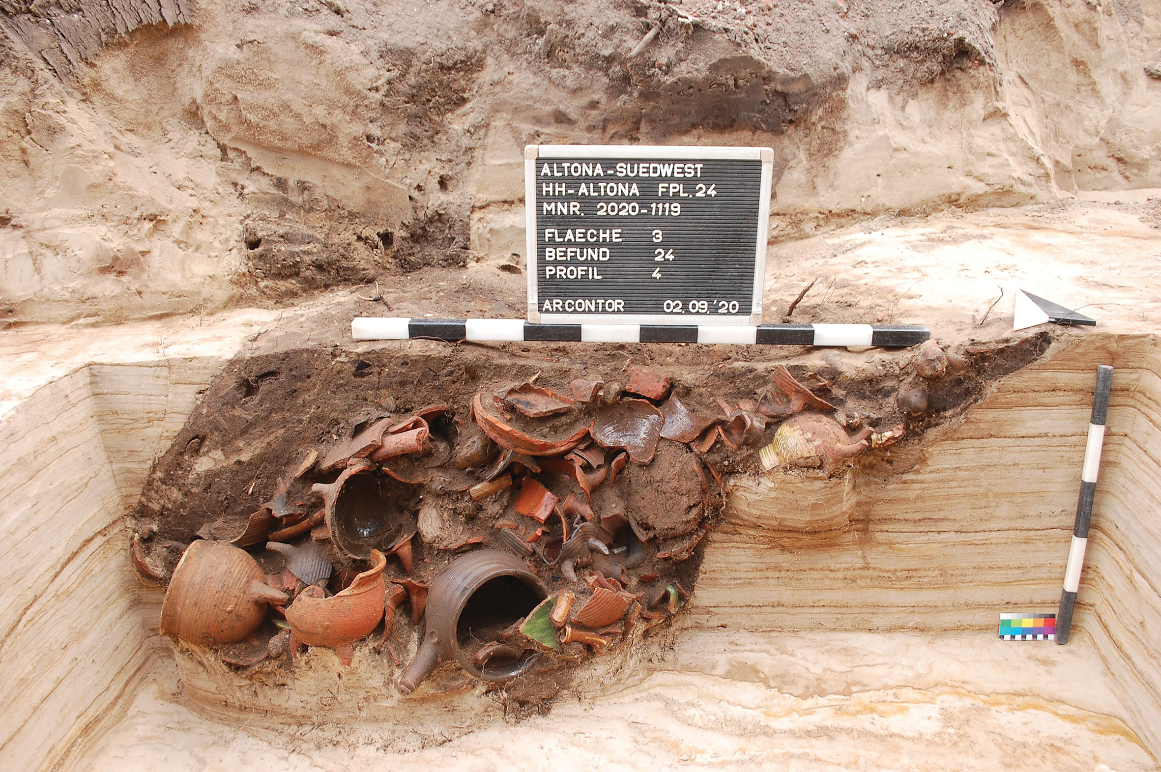 Frontispiece 1. Waste pit with misfired pottery vessels, under excavation during 2020 in the Altona district of Hamburg, Germany. The excavations, in advance of development of the site, have revealed two pits attesting to ceramic production during the first half of the eighteenth century. Products included lead-glazed tablewares, three-legged kettles, or ‘Grapen’, for cooking on an open hearth, and black-glazed stove tiles. Documentary records and the results of earlier excavations at the site indicate that, some time before 1770, production switched to an elaborate range of faience objects, including stove tiles, vases and chandeliers. By 1803, however, production at the site had ceased due to competition from other tablewares, including porcelain and English earthenware. Photograph © Maren Kaube, Arcontor Projekt GmbH.