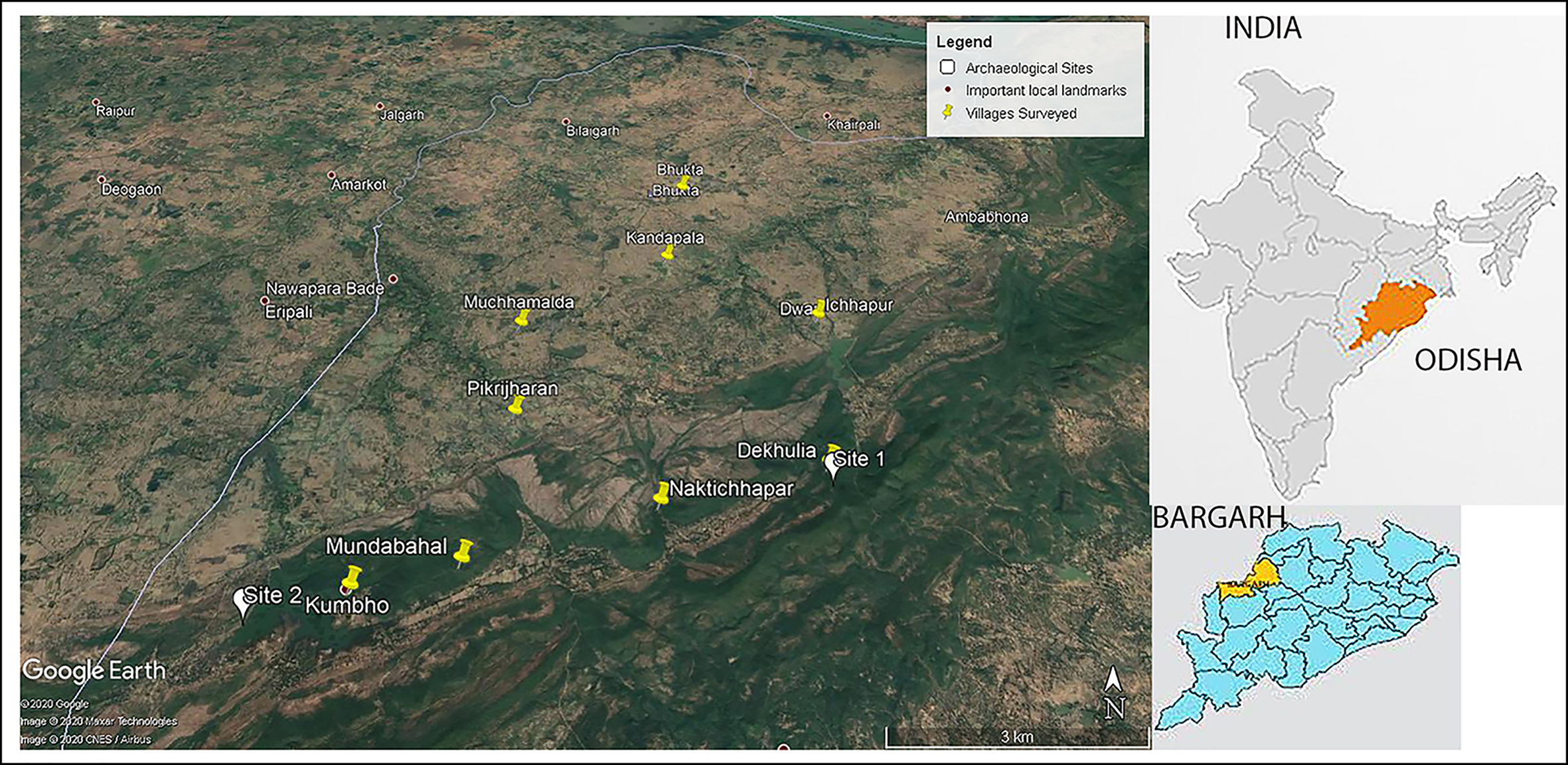 Figure 1. Location of the study region Bargarh, India, showing the villages studied and neighbouring archaeological sites in the region (Google Earth Pro, 15 January 2020, 21°34′48.45″ north, 83°24′16.69″ east, Maxar Technologies).