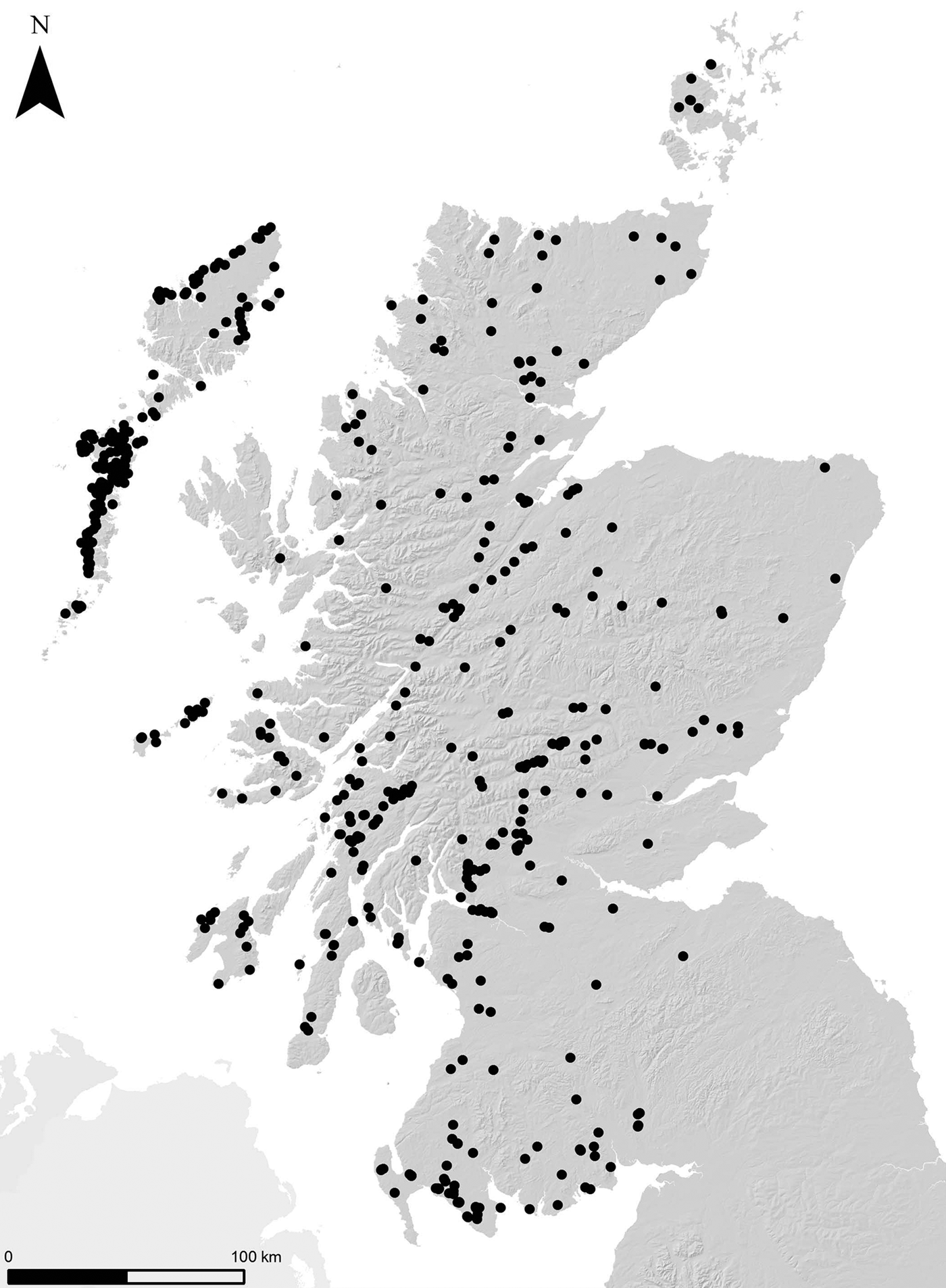 Figure 1. Distribution of island dwellings (including ‘crannogs’ and ‘island duns’) in Scotland (data from Lenfert Reference Lenfert2012: Appendix 1). Contains OS data © Crown copyright and database right 2019.