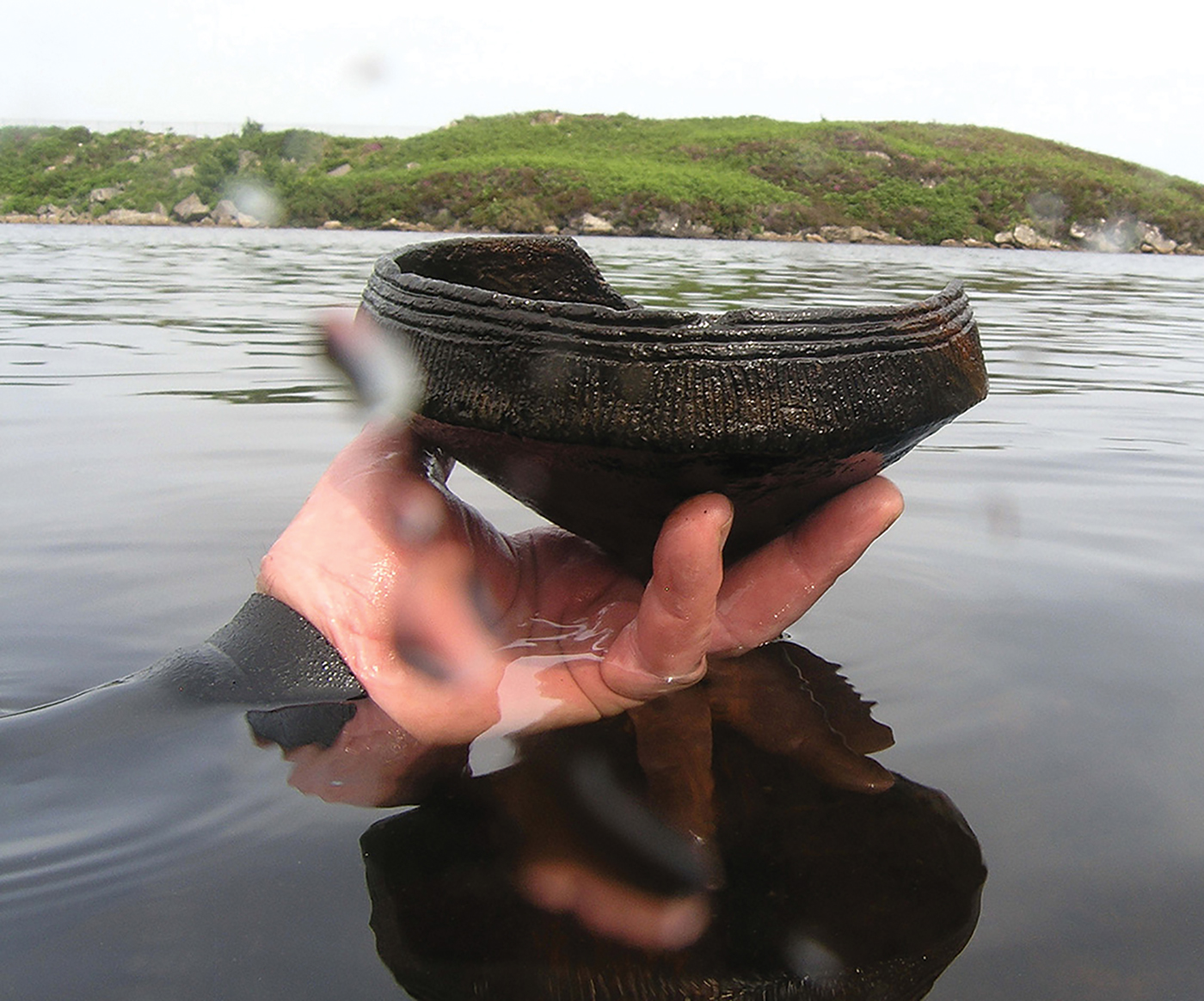 Figure 10. Recovering a substantial fragment of a ‘Hebridean Neolithic’ vessel from Loch Langabhat in 2017 (photograph by D. Garrow).