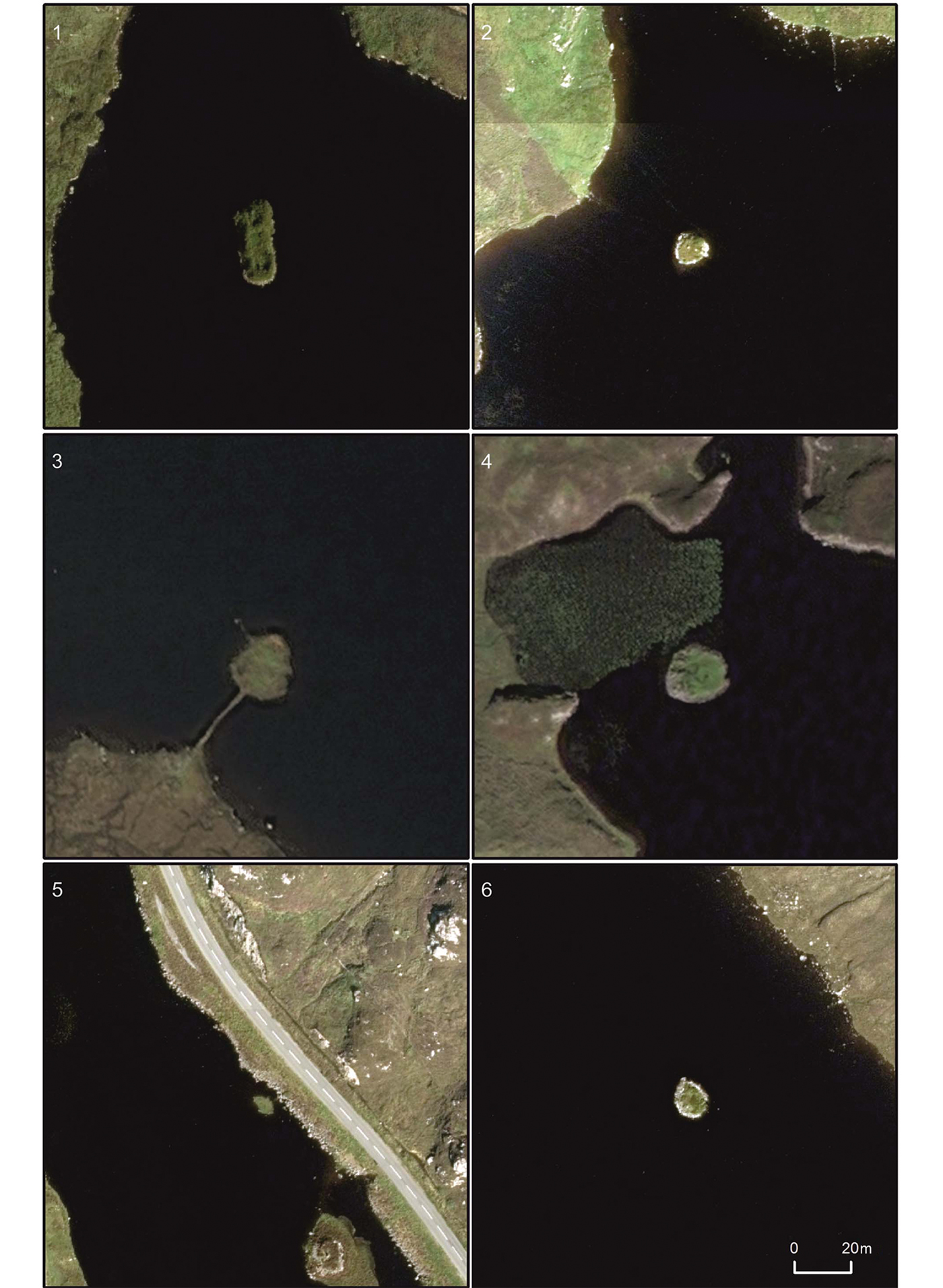 Figure 3. Aerial photographic comparison of the six islet sites known to have produced Neolithic material (all shown at the same scale): 1) Arnish; 2) Bhorgastail; 3) Eilean Domhnuill; 4) Lochan Duna (Ranish); 5) Loch an Dunain (Carloway); 6) Langabhat (images © of Getmapping PLC).