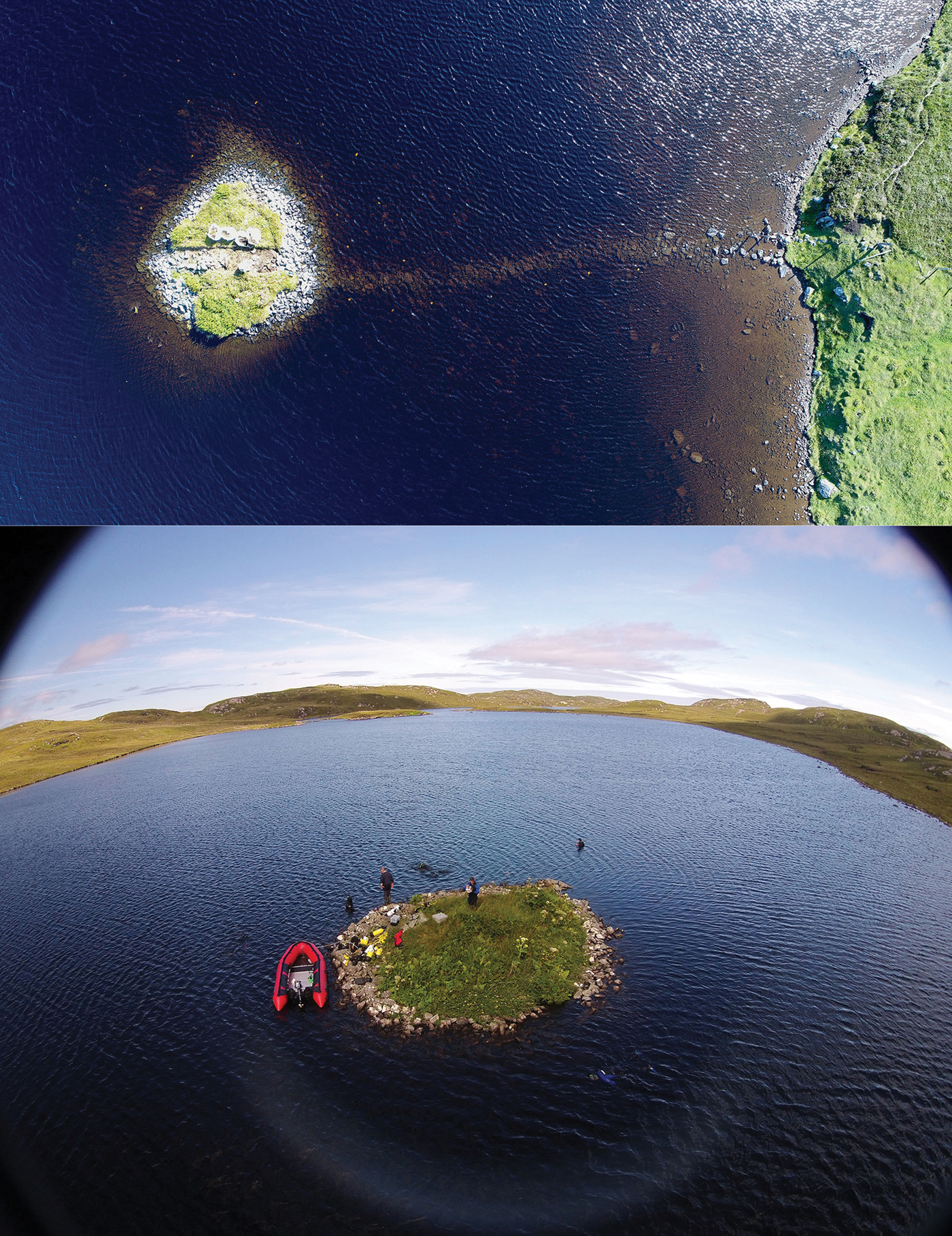 Figure 5. Aerial views of the islets in Loch Bhorgastail (top) and Loch Langabhat (bottom) (photographs by F. Sturt).