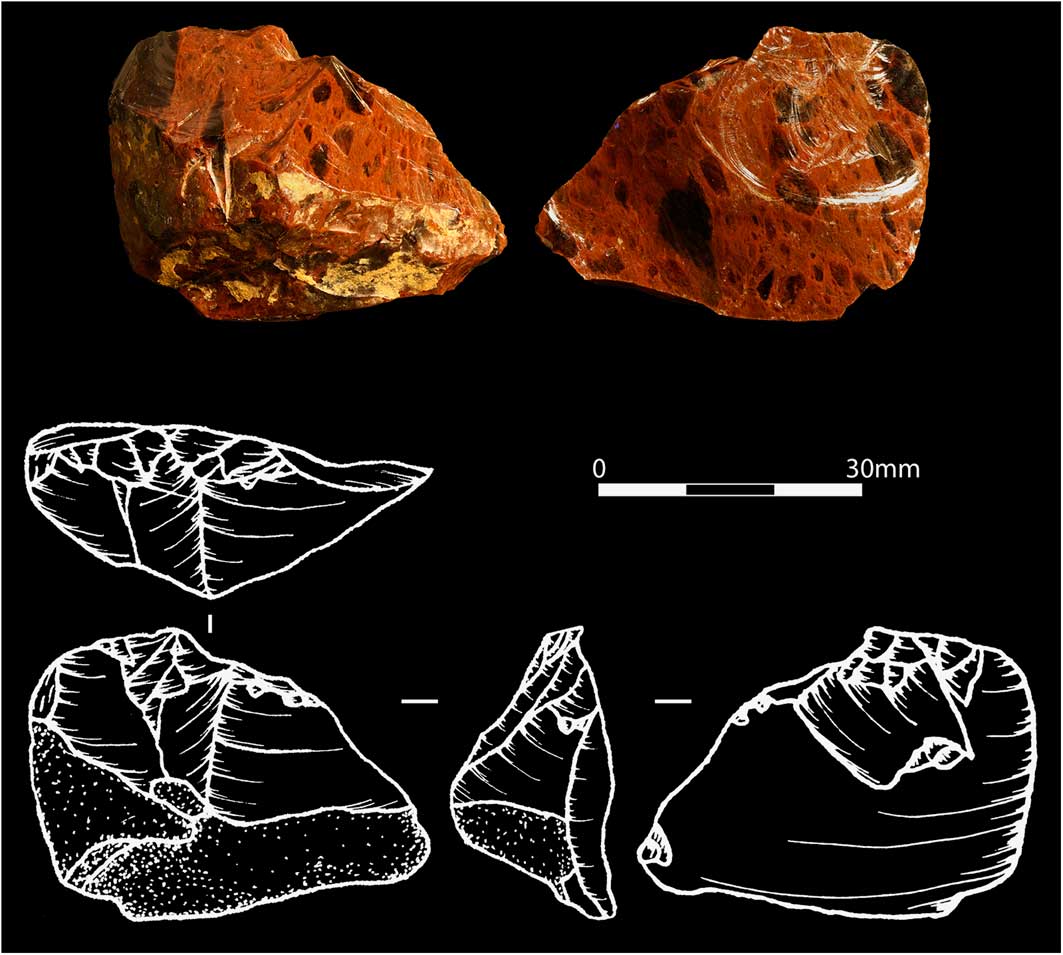 The artefact is an unmodified flake, or primary spall, of red-black mottled obsidian, measuring 43×33×19mm (Figure 1). It has cortex remaining on its dorsal side, and it was not a river pebble. The flaking negatives are similar to those that result from striking obsidian without suitable platforms. The prehistoric person may have attempted to smash the raw obsidian into a sub-rounded form using a hard hammerstone.