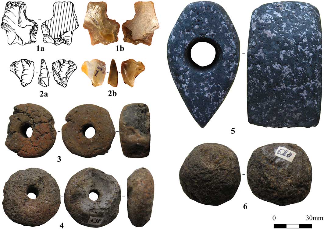 Figure 2 Selected artefacts from the Navasiolki 6 site: 1) fragment of a flint ground item with secondary retouch (a: drawing; b: photograph); 2) flint bipolar piece (a: drawing; b: photograph); 3–4) clay spindle whorls; 5) shaft-hole axe; 6) flint hammerstone (figure by authors).