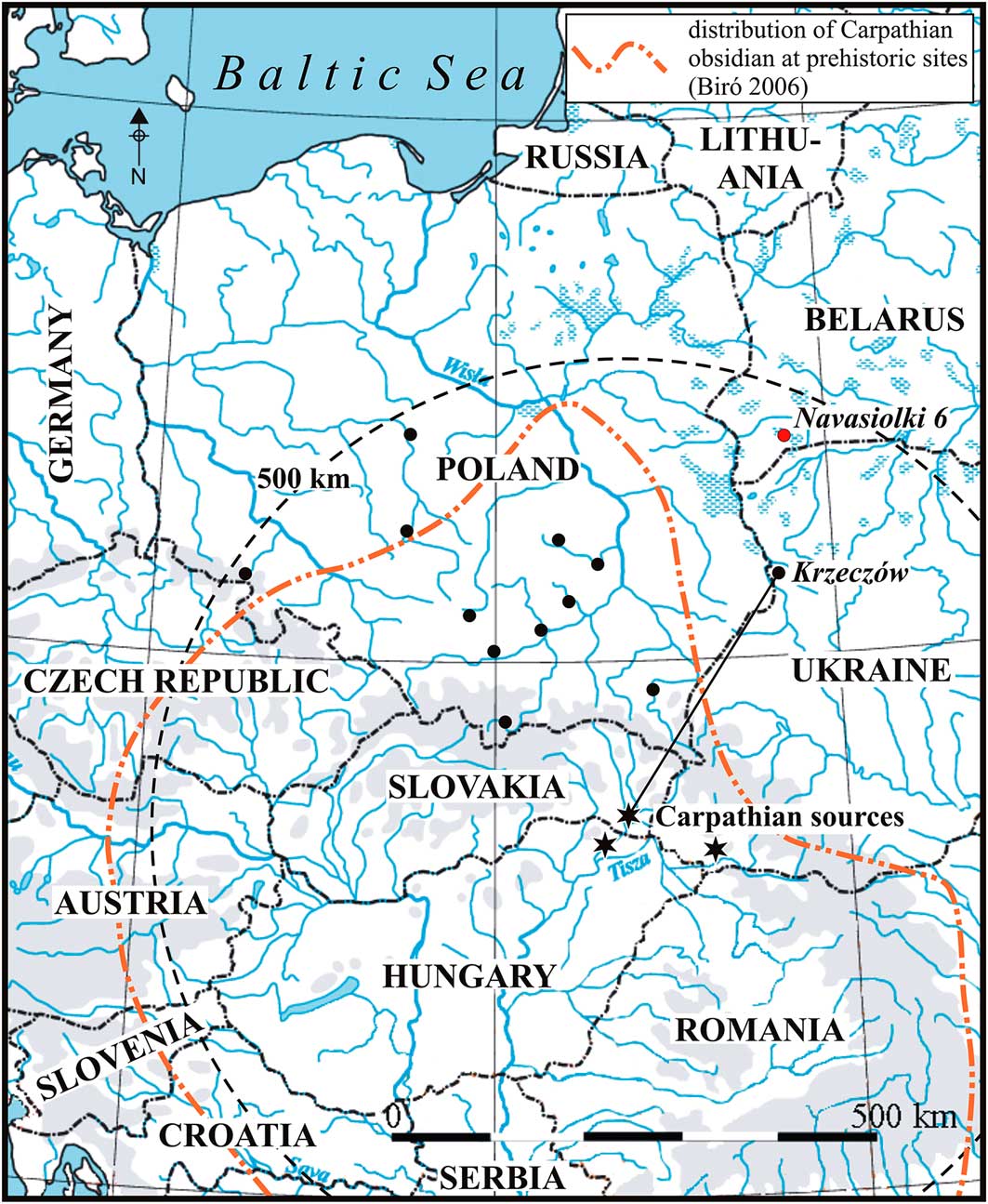 The provenancing of this find is important, as no obsidian from the Caucasus has been found so far north and west; in this part of Eastern Europe, only Carpathian obsidian—at distances up to approximately 500km from the primary source—is known within prehistoric assemblages (Figure 5). Although the Krzeczów site in north-western Ukraine yielded Carpathian obsidian (from the Brehov-Vinićky region in Slovakia; Figure 5) (Hughes et al. Reference Hughes, Werra and Sulgostowska2018), it was not detected farther north and east.