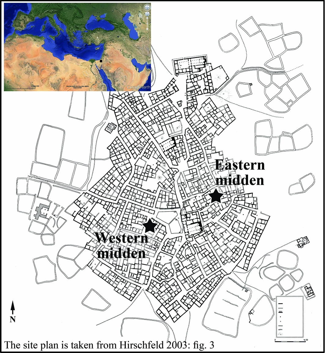 Figure 1. Shivta in geographic context. Situated in the central Negev, Shivta was part of the Byzantine Empire until the Islamic conquest. The site plan shows the location of two middens within the settlement.