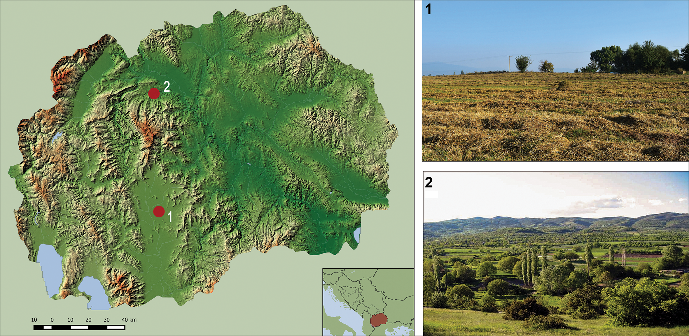 Figure 1. Map of North Macedonia (left) with the location and views of Vrbjanska Čuka (1) and Govrlevo (2) (map by G. Milevski and G. Naumov; photographs by G. Naumov & B. Kavur).