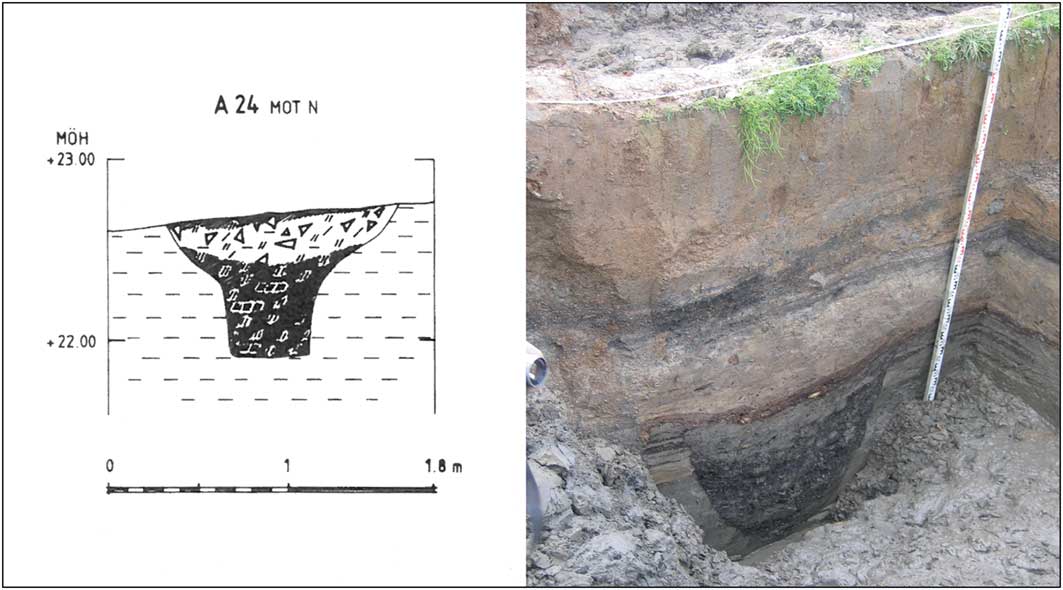 Figure 3 One of the large tar-production pits from a forested area to the north of Uppsala, and the section drawing from the excavation (photograph courtesy of Upplandsmuseet; drawing by Hennius et al. (Reference Hennius, Svensson, Ölund and Göthberg2005: 21))