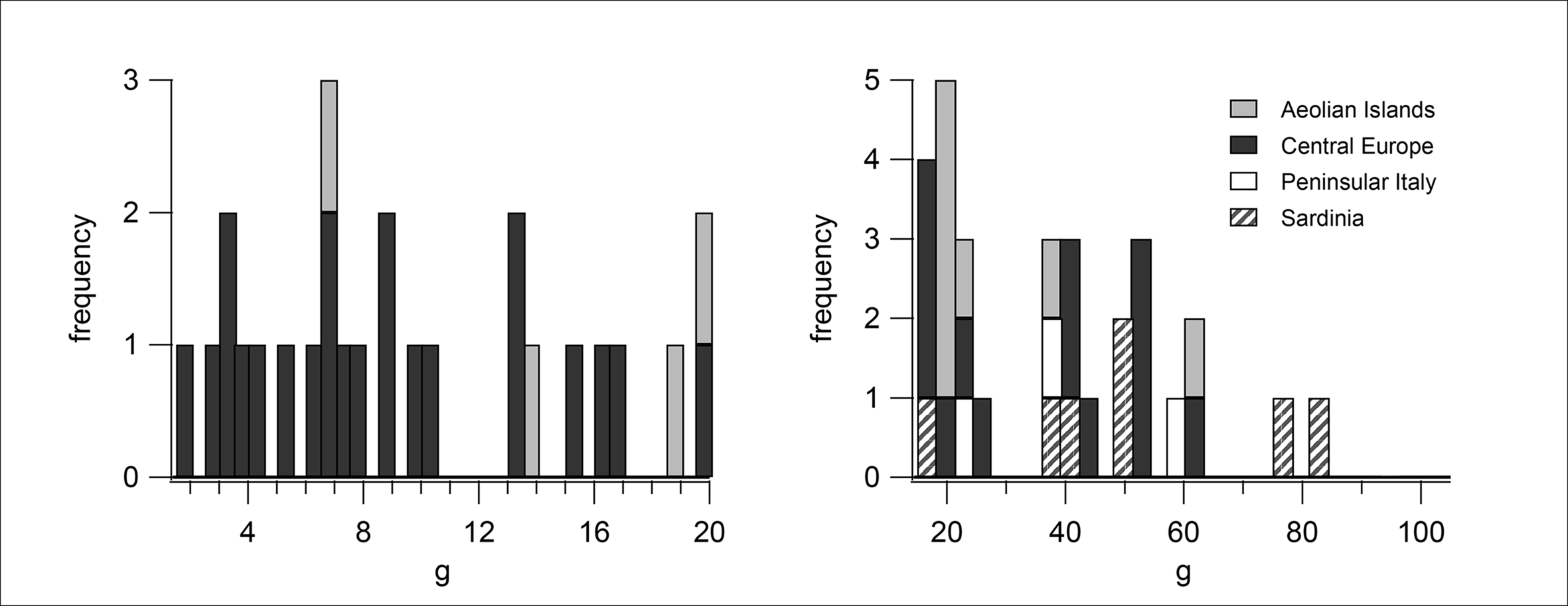 When dealing with large samples, it is necessary to first break the data into smaller ranges that can be analysed individually. This is best done via Frequency Distribution Analysis (FDA), in which a histogram is used to identify natural gaps, drops or mass clusters. The gaps define the range limits. A histogram of Bronze Age Aeolian, Central European, Italian and Sardinian balance weights, for example, shows neat clusters around 4g, 8g, 16g, 20g, 40g, 50g, 60g and 80g (Figure 1).