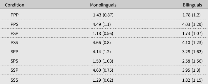Table 1. Mean acceptability ratings (and standard deviations) by condition, Experiment 1
