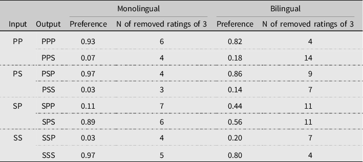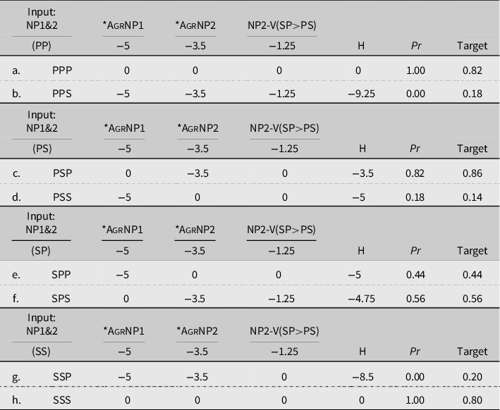 Table 3 presents the preference ratios for the input–output pairs for the monolingual and bilingual participants, and the total number of middle-point ratings of 3 that were excluded. For double plural NP input, the monolingual speakers had a near-categorical preference for the plural verb (PPP, 0.93) over the singular verb (PPS, 0.07), whereas the bilingual speakers were more accepting of the singular verb (PPS, 0.18). Monolingual speakers preferred a singular verb for the mismatched SP input (SPS, 0.89), but not categorically (SPP, 0.11). In contrast, the bilingual speakers showed no clear preference for the singular or the plural verb (SPP, 0.44; SPS, 0.56). These ratios are then used as target figures to fit the constraint weights.