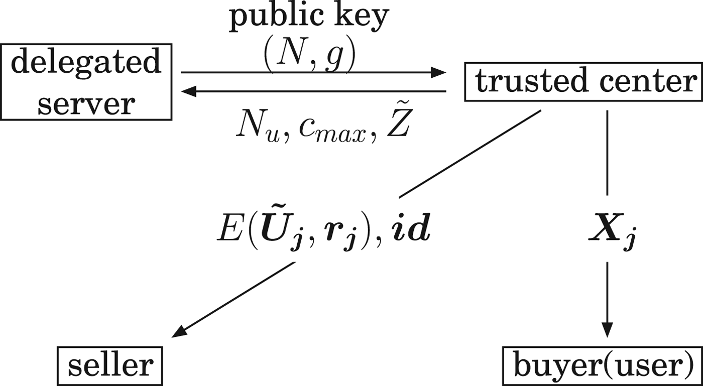 There are four parties in the system, trusted center, delegated server, seller, and buyer(user). The procedure is illustrated in Fig. 1.