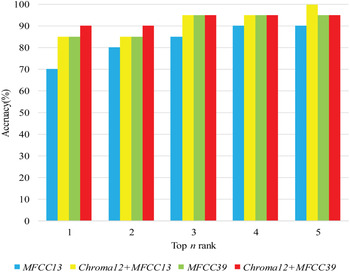 Chroma features can work well when queries and reference data are played from different music scores. It has been found that Chroma features can identify songs in different versions. Hence, we can use Chroma features to identify all kinds of songs, even cover versions [Reference Peeters17]. This research extends our previous work [Reference Chiang, Lee, Hsieh and Wang6]. Compared with [Reference Chiang, Lee, Hsieh and Wang6], a new feature vector containing 39-MFCCs features and 12-Chroma features are extracted.