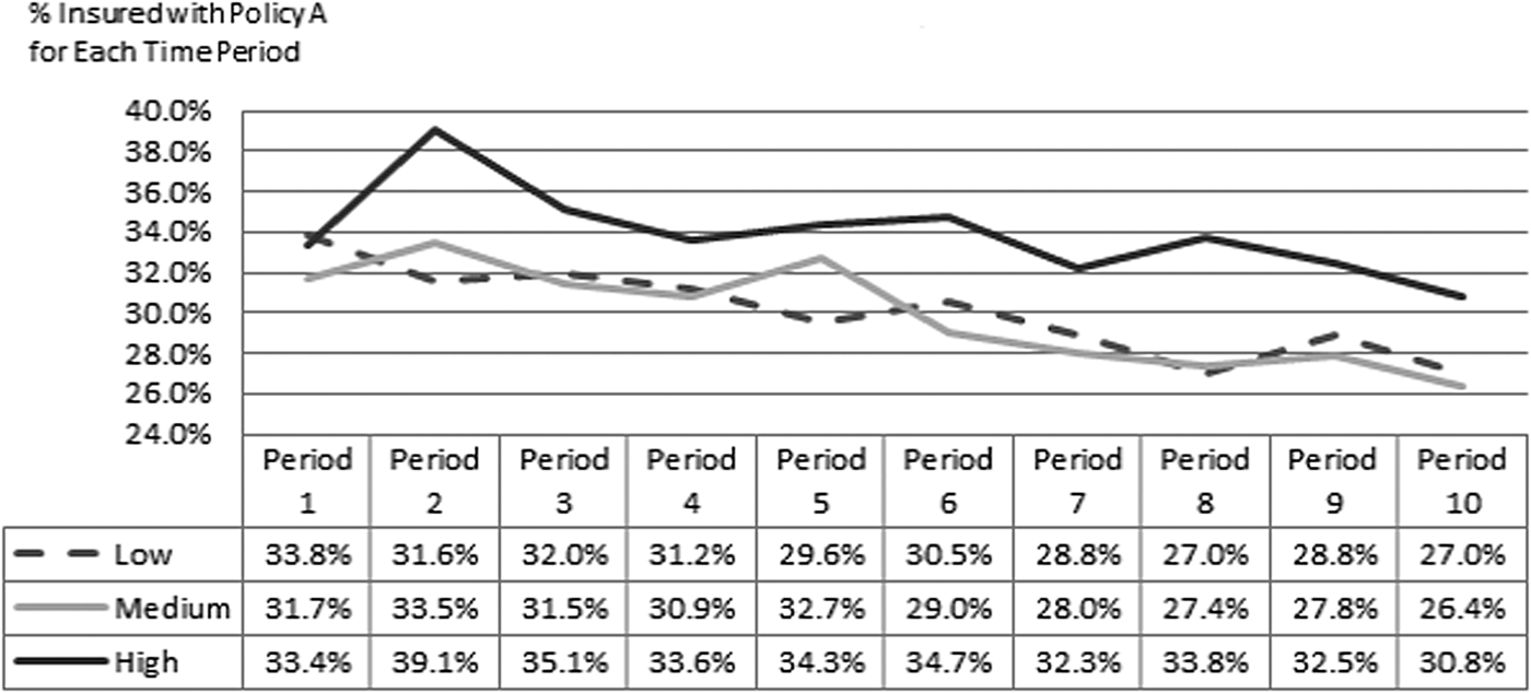 Figure 1 shows the actual pattern of choices of the high-deductible plan over time. Except for Period 1, the proportion of subjects choosing the high-deductible plan (Policy A) is consistently higher if they were in the high-premium group than in the other two premium groups. However, about a third of the subjects who were offered the subsidized premium still chose the high-deductible plan, as shown by the dashed line in Figure 1, inconsistent with expected utility maximization. There is a statistically significant difference between the greater percentage of individuals purchasing the high-deductible plan (Policy A) when faced with the high premium compared with the other two premiums; however, there is no statistical difference between the percentage purchasing Policy A for those offered medium and low premiums.