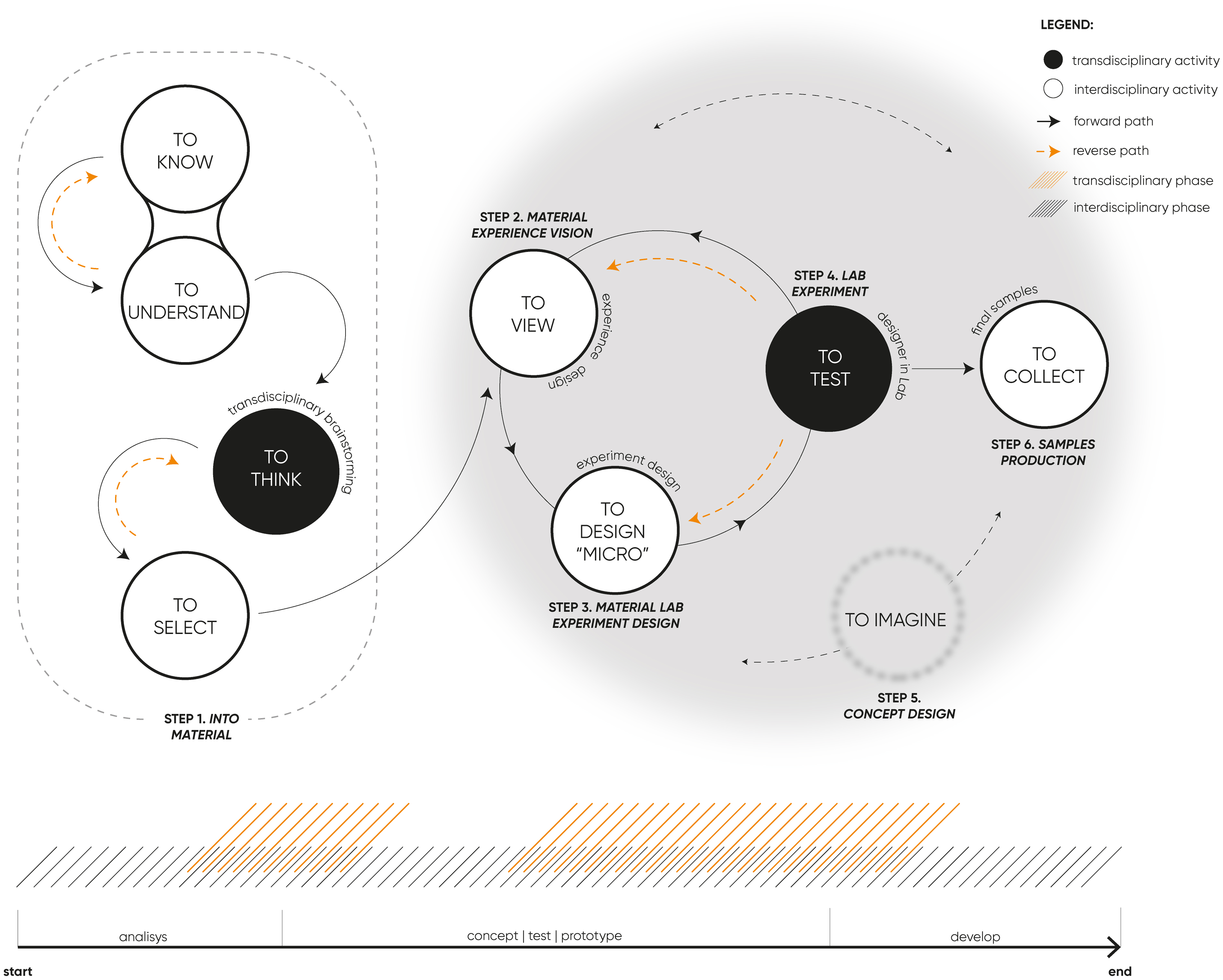 In this step, defined by the activity “To Imagine,” the student is asked to design potential concepts and application scenarios for the bio-fabricated material, using design-specific methods and tools in collaboration with other expert involved. The TMBT method emphasizes a strong influence of laboratory test data on scenario design. This influence is not strictly sequential but can occur at any point between Steps 2 and 6 (time range of influence shown in the gray area of Figure 1).