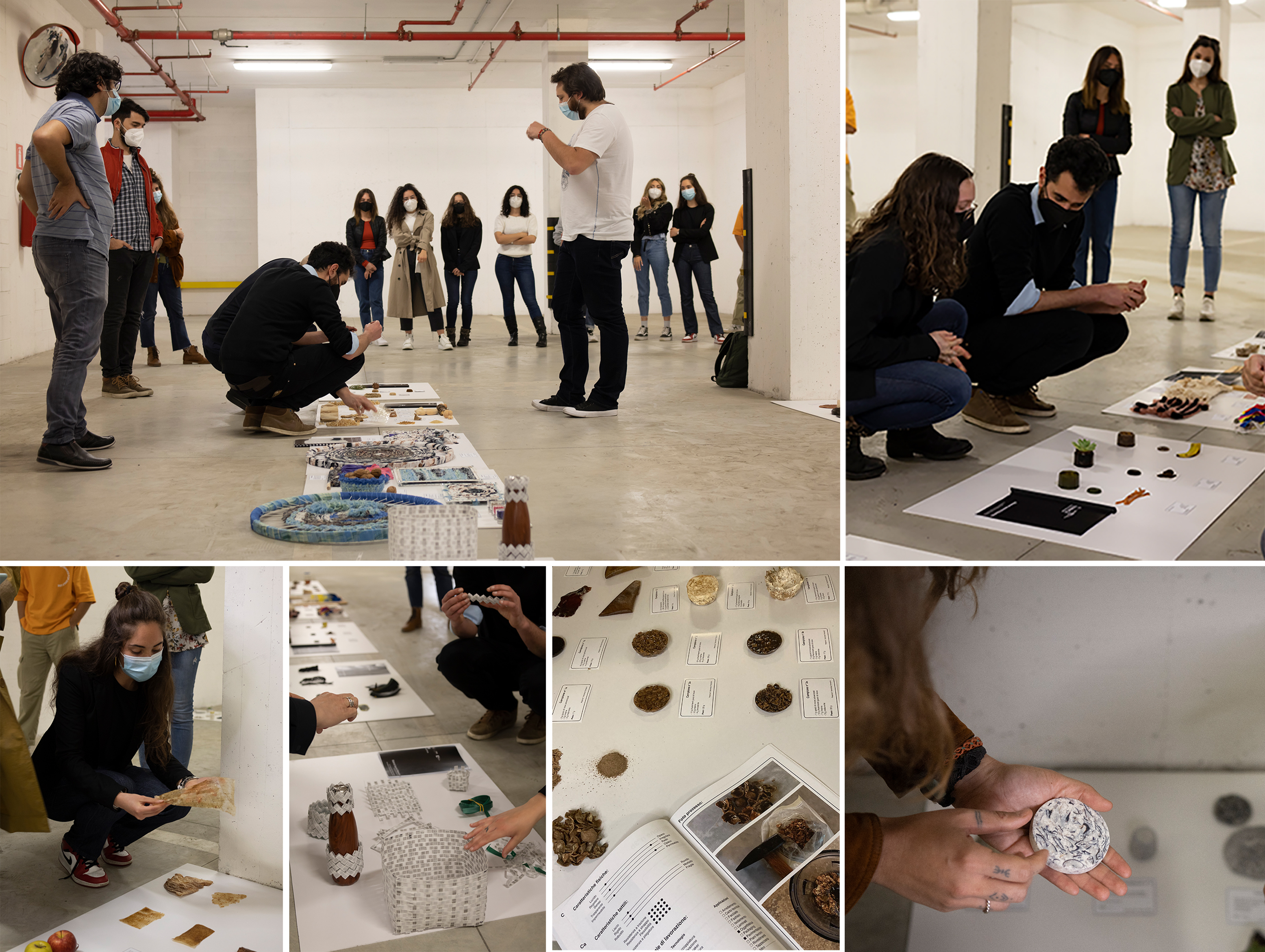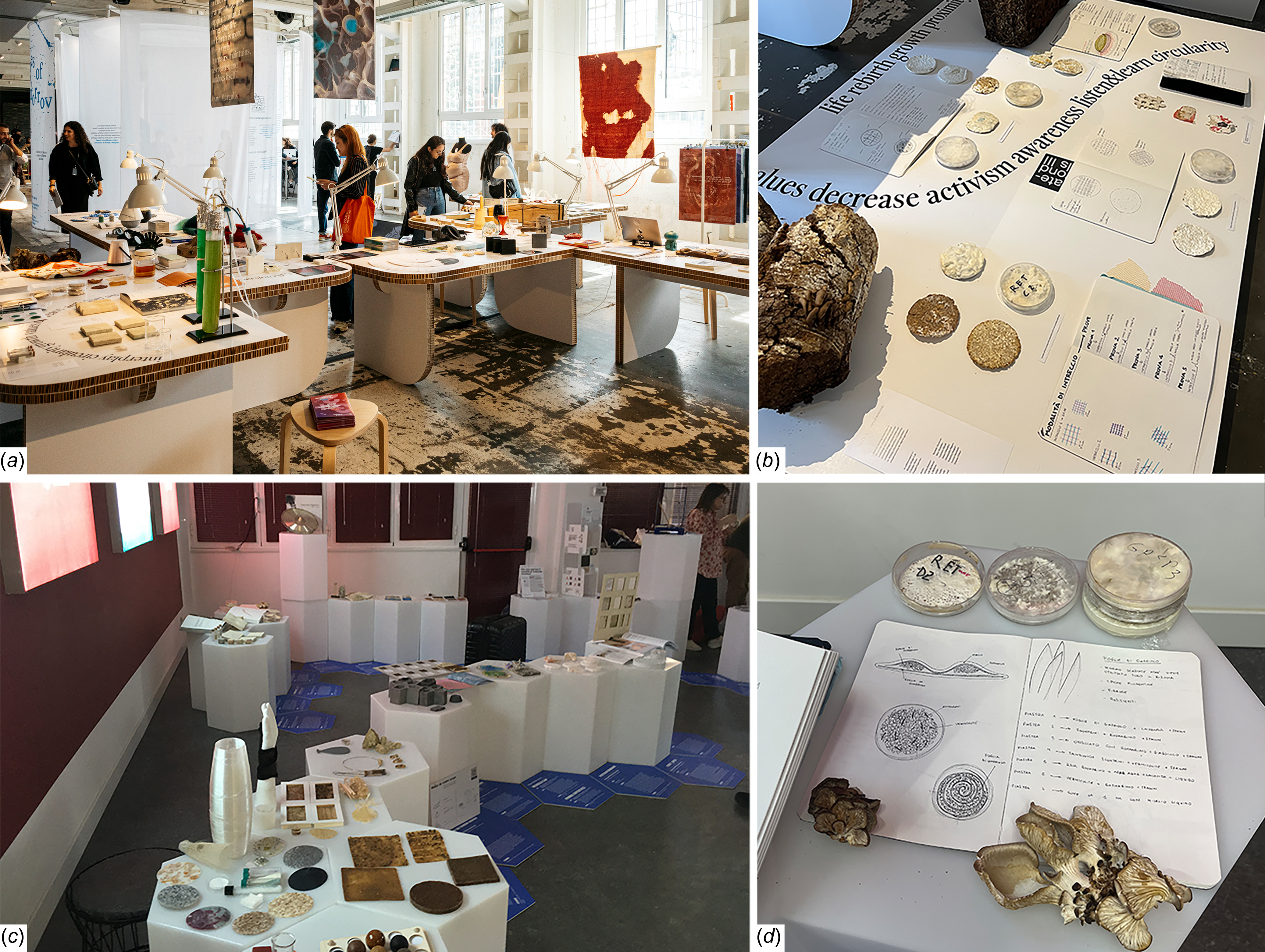 The first edition of MbM enabled students to complete their coursework by creating a material/semi-finished product based on circular economy principles, empirically experimenting with their ideas and producing DIY material samples (Rognoli et al., Reference Rognoli, Bianchini, Maffei and Karana2015), along with their respective physical and sensory characterizations. During this initial edition, references to other sciences – such as biology and materials science – were merely “borrowed,” with no direct contributions from experts in these fields. Students adopted a purely DIY approach, relying primarily on case studies and online databases related to DIY materials. On this basis, the first edition’s approach can be classified as multidisciplinary or pluridisciplinary (Max-Neef, Reference Max-Neef2005) (Moreno and Villalba, Reference Moreno and Villalba2018). That is, design leveraged knowledge previously developed in other disciplines, attempting to integrate it into the design of new materials without specific coordination among the disciplines involved. In this context, while the design approach shared numerous perspectives with other fields of knowledge, its aim was to borrow references from other disciplines without losing its distinctive creative and experimental nature, which was oriented toward achieving practical solutions. At the end of the workshop, feedback from students was collected informally through a classroom work session and direct observation. The results of the final feedback proposed to participants showed a general satisfaction with the students’ experience, especially regarding the exploratory phase and the material tinkering process. However, the informal feedback also highlighted some critical issues, including: the limited basic knowledge of materials design by students (due to the absence of contributions from other disciplines and methodologies), the lack of a laboratory and the necessary tools for material modification and, finally, the poor knowledge of biological materials and processes – such as fungi, algae and bacteria – especially regarding their functional and microscopic aspects (due to the lack of adequate equipment). The workshop program ended with a final exhibition at the Design Campus (University of Florence), where all the projects were displayed (Figure 2).
