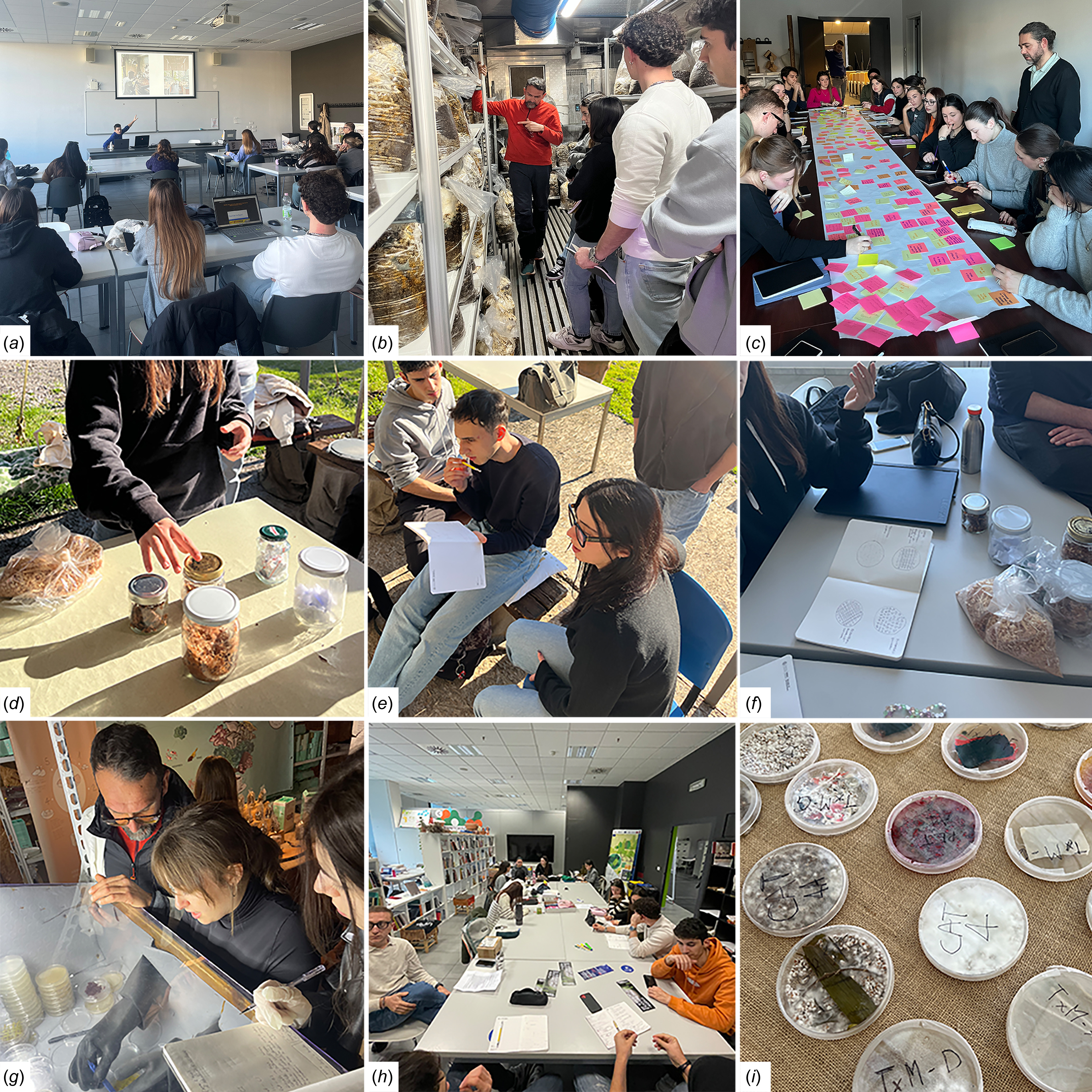 Figure 4. Participants engaged in the Transdisciplinary Material BioTinkering (TMBT) method during the MbM III – Biodesign Edition. Highlights include activities: a) To Know; b) To Understand; c) To Think; d) To Select; e) To View; f) To Design Micro; g) To Test; h) To Imagine, i) To Collect.