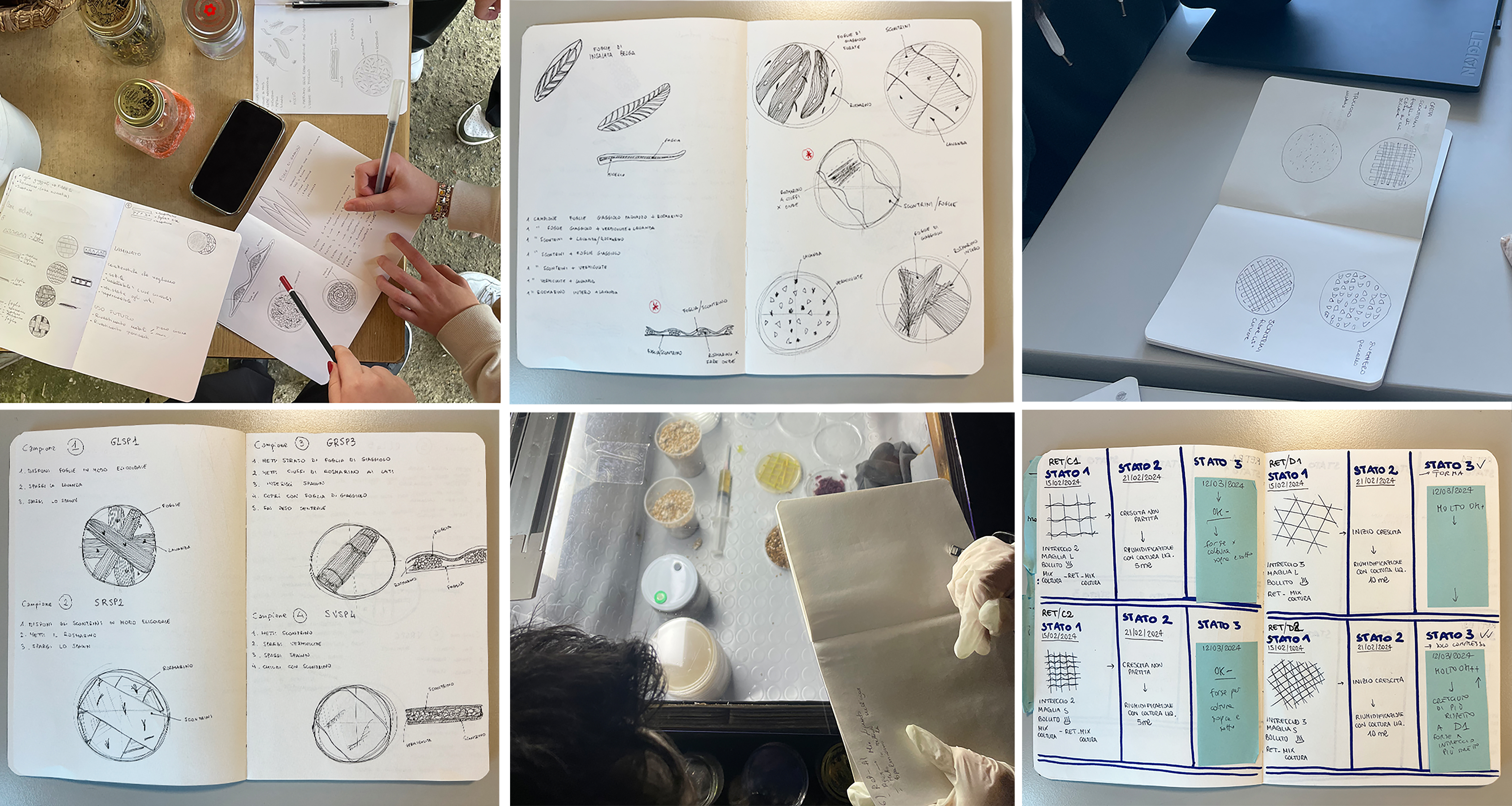 While TMBT retains the designer’s rapid solution-finding approach, it also allows for exploration of multiple alternatives if the initial solution does not meet the design intentions. Steps such as Material Experience Vision, Material Lab Experiment Design and Lab Experiment, along with the overarching Concept Design, incorporate recursive processes similar to the scientific method. These steps rely on inductive and deductive insights, supplemented by the abductive reasoning typical of designer. Thus, with TMBT, a possible solution is quickly identified; the difference compared to a traditional design process lies in the ability to investigate a number of possible solutions if the first one does not align with the design intentions. Indeed, steps 2 – Material Experience Vision, 3 – Material Lab Experiment Design and 4 – Lab Experiment and in a transversal way step 5 – Concept Design, in analogy with the scientific method, are recursive and based on inductive-deductive intuitions but fueled by the abductive thinking process typical of designers. In these four stages, the use of the biodesign agenda was essential, as students took notes, described the material, designed the material and the experiment – from the micro scale to sensory aspects – along with the conceptualization of possible applications (Figure 5).