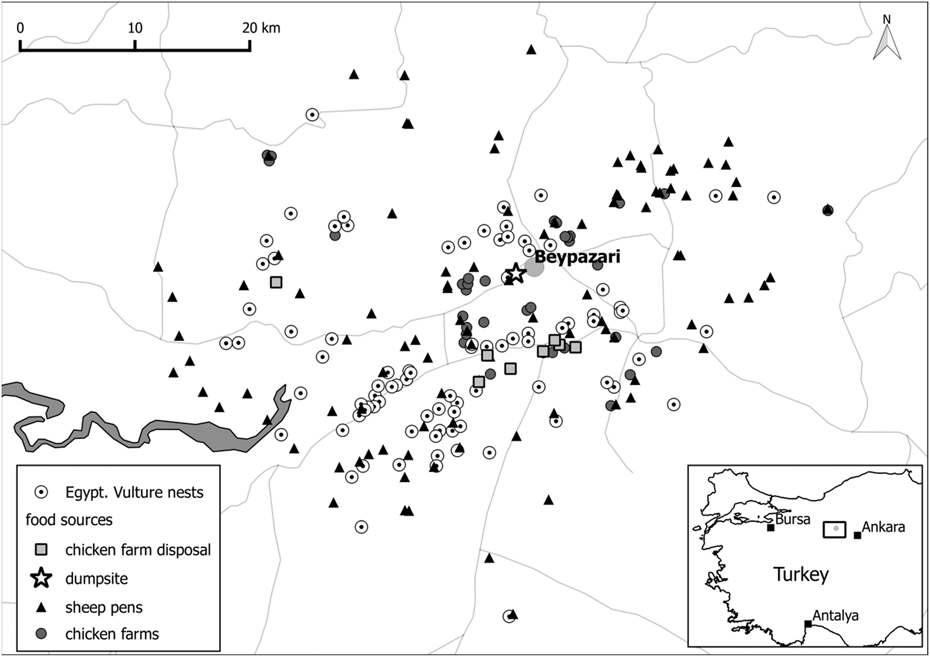 We studied Egyptian Vultures near the town of Beypazarı in Ankara province in Central Anatolia, Turkey (40°05’N, 31°53’E; Figure 1). The study area (1,293 km2) ranges from 400 m to 1,800 m elevation, and contains high biodiversity which is captured by three Key Biodiversity Areas: Kirmir Valley, Sarıyar Dam and Nallıhan Hills (Eken et al. Reference Eken, Bozdoğan, İsfendiyaroğlu, Kılıç and Lise2006). The southern and western parts of the study area are mainly composed of grasslands with low-intensity livestock grazing along with intensive agriculture, while the northern part is more forested and mountainous. Traditional and industrial agricultural practices provide three principal types of feeding opportunities for vultures (Figure 1): sheep pens, chicken farms, and chicken farm disposal sites. While sheep pens and chicken farms occasionally discard livestock carcasses, the chicken farm disposal sites hold large quantities of chicken remains and excrement which are spread on grasslands to act as fertilizer. The single-most important congregation site for Egyptian Vultures with up to 50 birds attending simultaneously used to be the municipal rubbish dump of Beypazarı. This facility was officially closed in March 2015 because the close proximity of the rubbish dump to existing and developing settlements and recreational areas created a health hazard risk to the public. The rubbish dump closure provided the opportunity to specifically test whether the removal of such a predictable food source affected the reproductive parameters of Egyptian Vultures.
