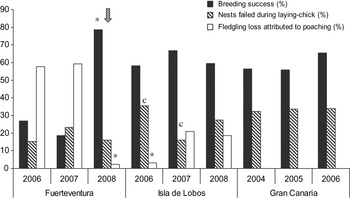 Figure 2. Breeding success (%), nests failed during laying-chick stage (%), and fledgling loss attributed to poaching (%) by years on Fuerteventura, Isla de Lobos and Gran Canaria. The arrow marks the year and colony subject to the intense surveillance campaign.