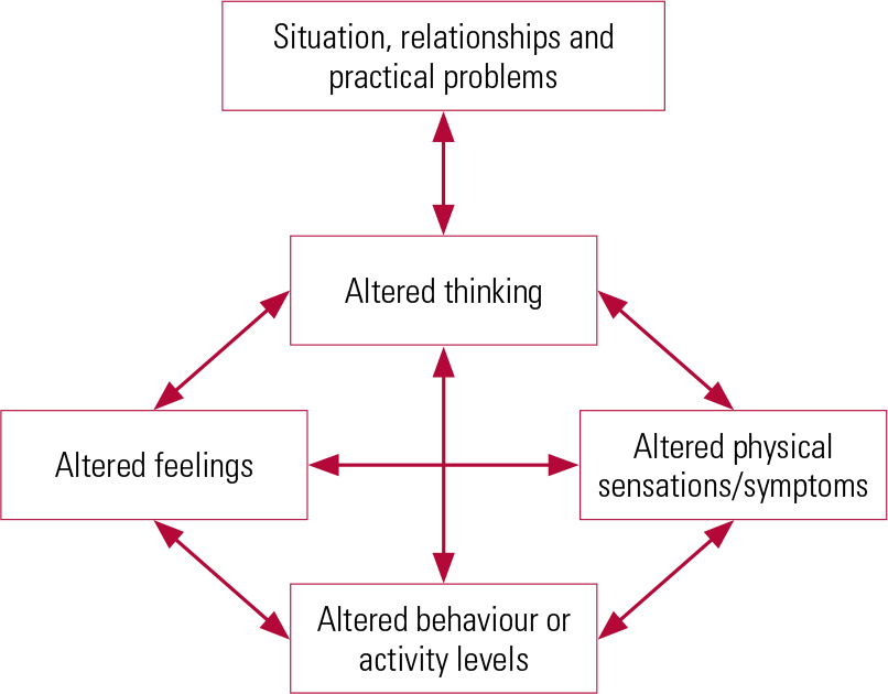 A CBT-based formulation, or clinical summary, is essentially a ‘vicious circle’ model. It argues that there are two-way relationships between what people think, how they feel emotionally and physically, and what they do (Fig. 1). Crucially, it also incorporates the supports (or not) around the person, together with the practical issues and challenges faced on a daily basis. Each area interacts with the others to affect the person’s overall experience. CBT aims to help patients identify and move towards more helpful styles of thinking, behaving or relating to others. Because of the nature of a vicious circle, interventions can be made at any point, and any intervention made can break or improve the overall vicious circle. The aim is also to build on current and past helpful/ adaptive responses and resources.