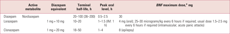 Table 3 shows the different potencies, rates of absorption and onset, and duration of action (terminal half-life) for diazepam, lorazepam and clonazepam in healthy volunteers. The potency of clonazepam is notably higher than that of diazepam, but its duration is shorter, meaning that the equivalence with diazepam is initially 20:1, but diazepam accumulates to a greater extent and the equivalence in long-term use is about 10:1 (Ashton Reference Ashton2002; Taylor Reference Taylor, Barnes and Young2015).