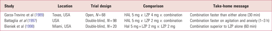 The trials shown in Table 4 showed faster control of symptoms with the intramuscular antipsychotic plus benzodiazepine combination. For example, a multicentre study involving 98 psychotic, agitated, aggressive patients in five emergency rooms in the USA reported that the combination was superior to lorazepam (2 mg) and to haloperidol (5 mg) alone in psychotic agitation at 1–3 h (Battaglia Reference Battaglia, Moss and Rush1997).