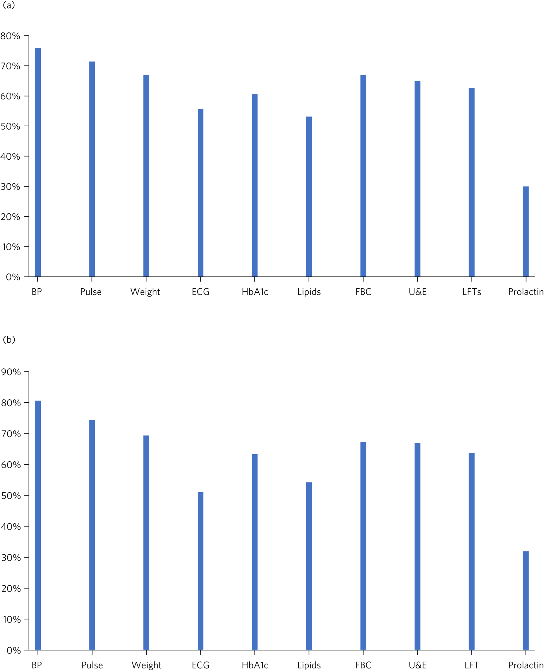 Fig. 2 Physical health monitoring. (a) Proportion of patients who had the specified physical health parameter measured at baseline (n = 203) (data from initiation form). (b) Proportion of patients who had the specified physical health parameter measured on review (n = 504) (data from review form). BP, blood pressure; ECG, electrocardiogram; HbA1c, glycated haemoglobin; FBC, full blood count; U & E, urea and electrolytes; LFTs, liver function tests