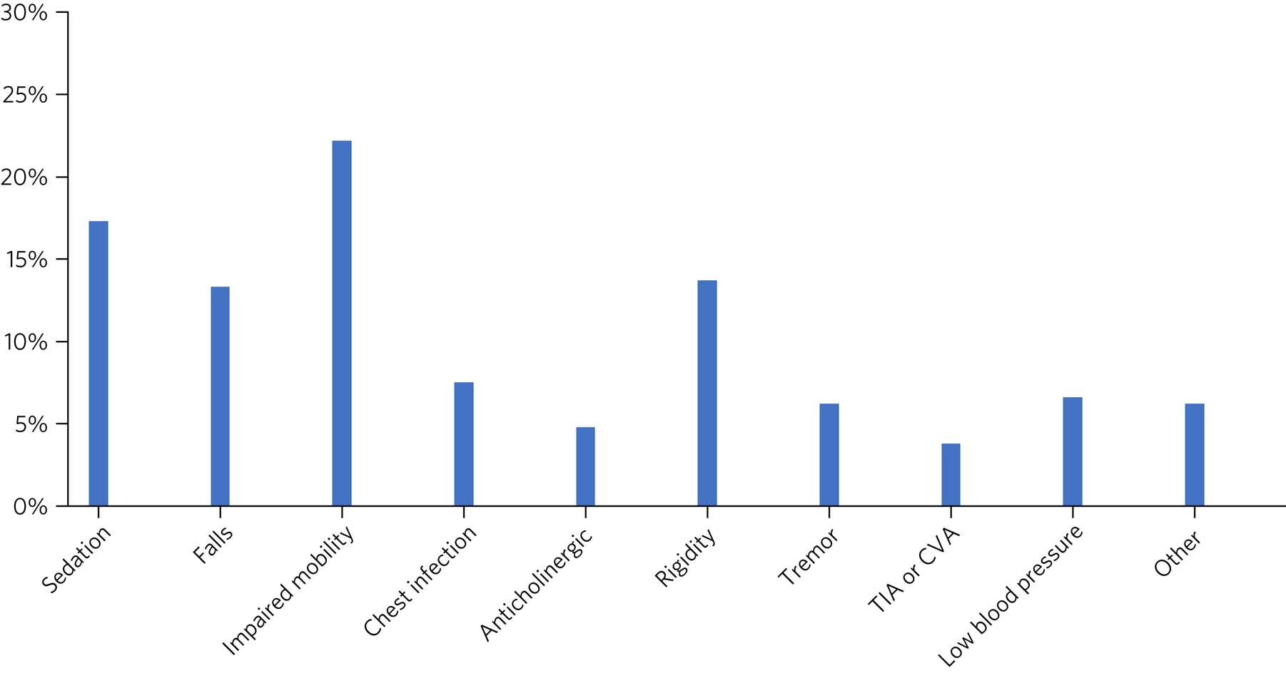 In 42.7% of forms it was reported that no side-effects had been observed with the antipsychotic drug, whereas the remainder indicated that the patient had experienced one or more side-effect. Figure 3 shows that the most commonly reported side-effects were impaired mobility, sedation, rigidity and falls. Nineteen forms (3.8%) indicated that the patient had a TIA or CVA.