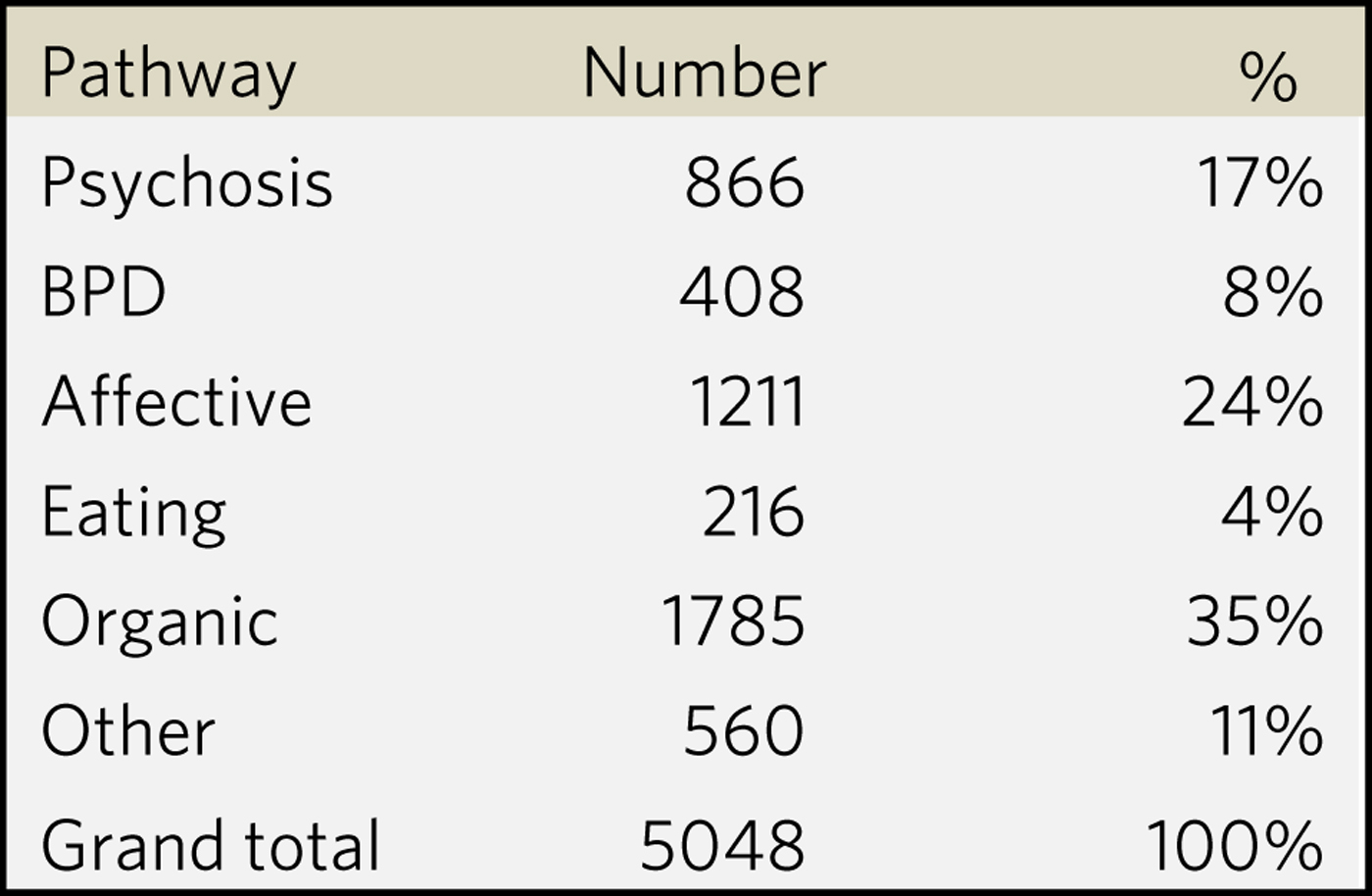 A total of 5048 patients were rated and allocated to a pathway in the first 3 months (Fig. 3). Over 90% of HONOS items were completed: 70% of patients were assessed against relevant standards and 50% of patients (excluding organic pathway) had DIALOG completed.