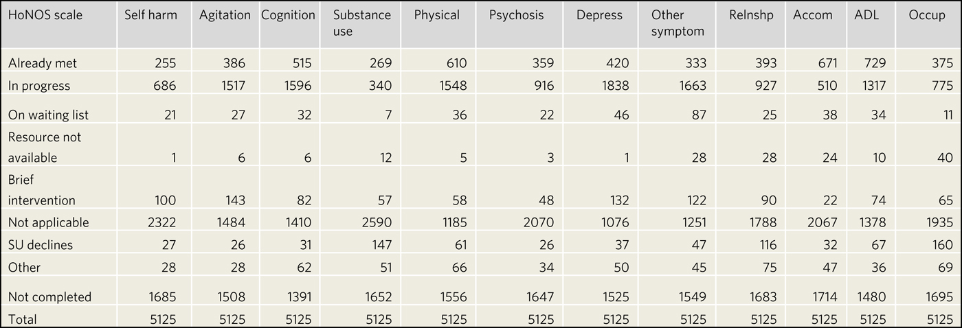 HoNOS, Health of the Nation Outcome Scales; depress, depression; relnshp, relationships; accom, accommodation; ADL, aids to daily living; occup, occupation; SU, service user.