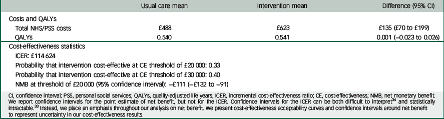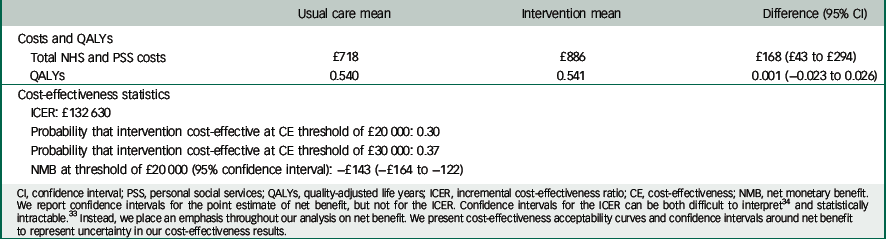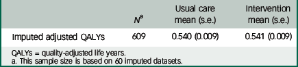 The QALYs were calculated to adjust for baseline EQ-5D scores (Table 3). The control arm baseline mean EQ-5D score was 0.52 (s.e.=0.02) compared with an intervention baseline EQ-5D score of 0.51 (s.e.=0.02), calculated using the imputed data-set.