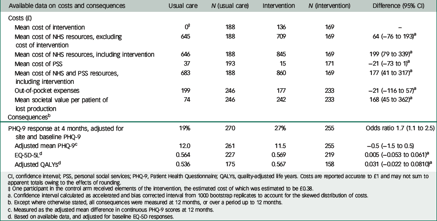 The value of lost production was approximately three times higher in the intervention arm for the following reasons. Intervention participants reported a greater number of days affected by depression (mean per patient in available cases: 12.4 working days (s.d.=42.0) in the intervention arm compared with 5.2 working days (s.d.=15.7)) and more hours taken from work to attend healthcare appointments (mean per patient in available cases: 12.8 h (s.d.=86.8) in the intervention arm compared with 2.9 h (s.d.=12.5)).