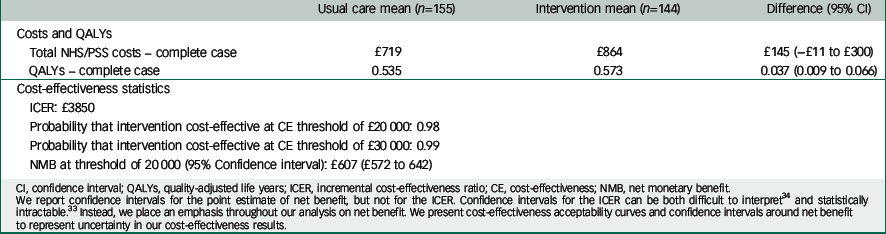Incremental cost-effectiveness ratios (ICERs) were calculated from estimated coefficients. To avoid the complicationsReference Drummond, Sculpher, Claxton, Stoddart and Torrance 33 , Reference Briggs 34 of calculating confidence intervals around ICERs, confidence intervals are presented only for net benefit statistics, which were calculated parametrically from regression output.Reference Gray, Clarke and Wolstenholme 35 Net monetary benefit estimates were calculated using threshold values of £20 000 and £30 000 suggested by the NICE for use within NHS decision-making. 15 Costs and outcomes were not discounted as trial follow-up was limited to 12 months. Analysis was conducted using an ‘intention to treat' approach.