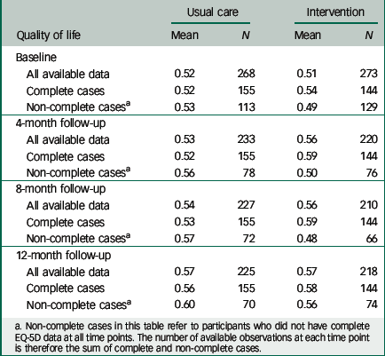 a Non-complete cases in this table refer to participants who did not have complete EQ-5D data at all time points. The number of available observations at each time point is therefore the sum of complete and non-complete cases.