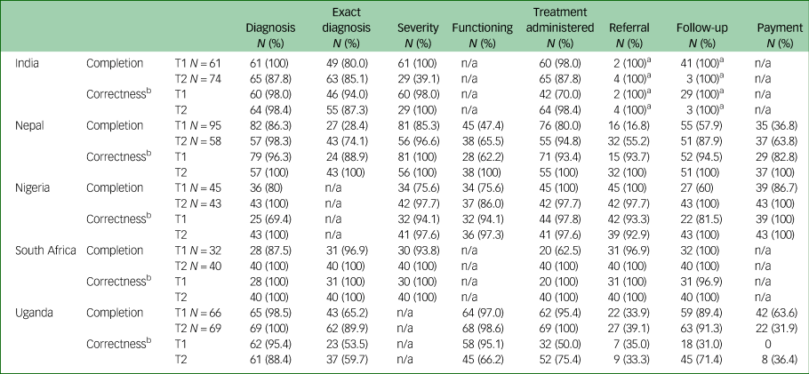 Across the five sites, 272 health workers were interviewed and 586 case records were reviewed. Table 2 shows the performance ratings of the new indicators with regard to levels of completion and correctness of completion. Overall, high levels of completion and of correctness were achieved for most of the indicators at both time points. The combined completion and correctness ratings for both time points were especially high for diagnosis (94 and 95%, respectively), severity (83 and 99%, respectively) and treatment (92 and 86%, respectively). These scores were slightly lower for exact diagnosis (72 and 84%, respectively), functioning (76 and 83%, respectively) and follow-up (83 and 82%, respectively). To give an indication of the samples of cases for which records were reviewed, the breakdown of diagnoses recorded was as follows (for T1 data): AUD (18% in Nepal, 3% in Uganda, 20% in India, 22% in Nigeria); depression (28% in Nepal, 100% in South Africa, 14% in Uganda, 46% in India, 60% in Nigeria); epilepsy (13% in Nepal, 68% in Uganda, 5% in Nigeria); psychosis (32% in Nepal, 5% in Uganda, 1% in India, 13% in Nigeria); and others (such as anxiety disorders, dementia, development disorders; 9% in Nepal, 10% in Uganda, 33% in India).