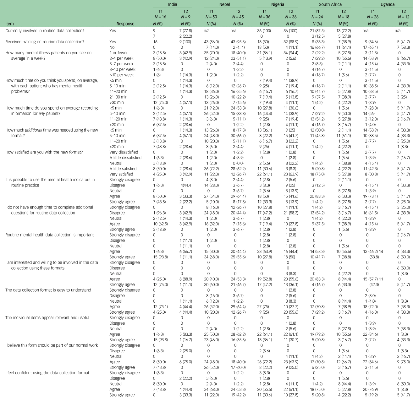Second, health workers' views about the feasibility of the routine conduct of mental healthcare monitoring using the new forms were generally positive across the five settings (and especially so in Nepal and Nigeria). The majority of measurements across countries and time points had more than 80% positive responses regarding the importance attached to them, the motivation and ease of their use, the usefulness of the collected information, the perceived need for the indicators and level of confidence in using them. Health workers were less positive about the additional time required for the completion of the forms. There was a trend of a downward drift in positive attitudes over time, though these were mostly observed in South Africa.