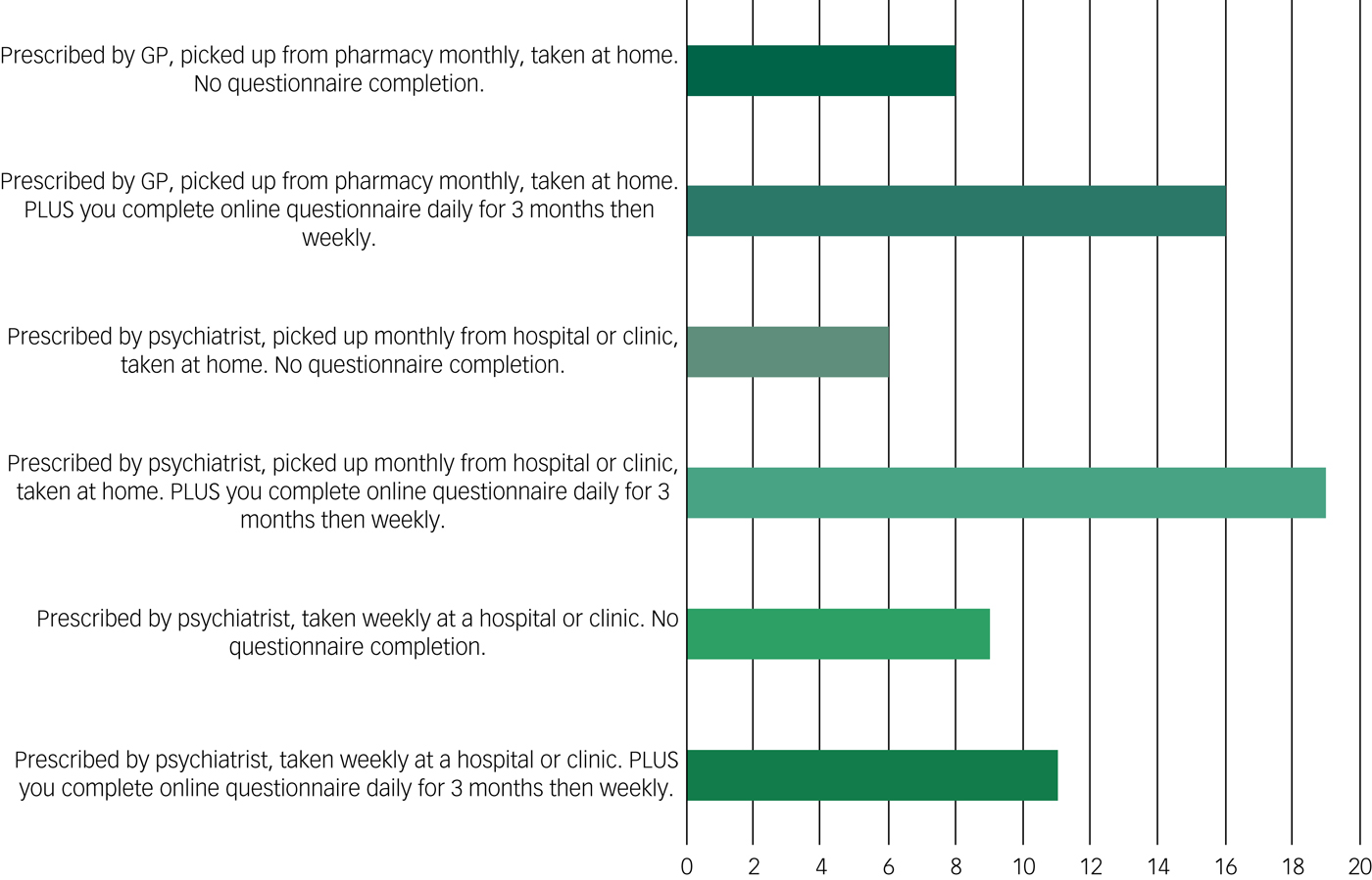In each session there were seven discussion groups, of 5 to 8 participants each with a facilitator and scribe, one of whom was a patient–researcher, and the other person was a graduate research assistant working in mental health research. The groups remained the same for all discussions in session 1 but then individuals were reallocated for sessions 2 and 3. The topic guide and voting questions are shown in Appendices 1 and 2. Participants were also invited to feedback in writing in response to the following: ‘What would be your ideal prescribing solution?’