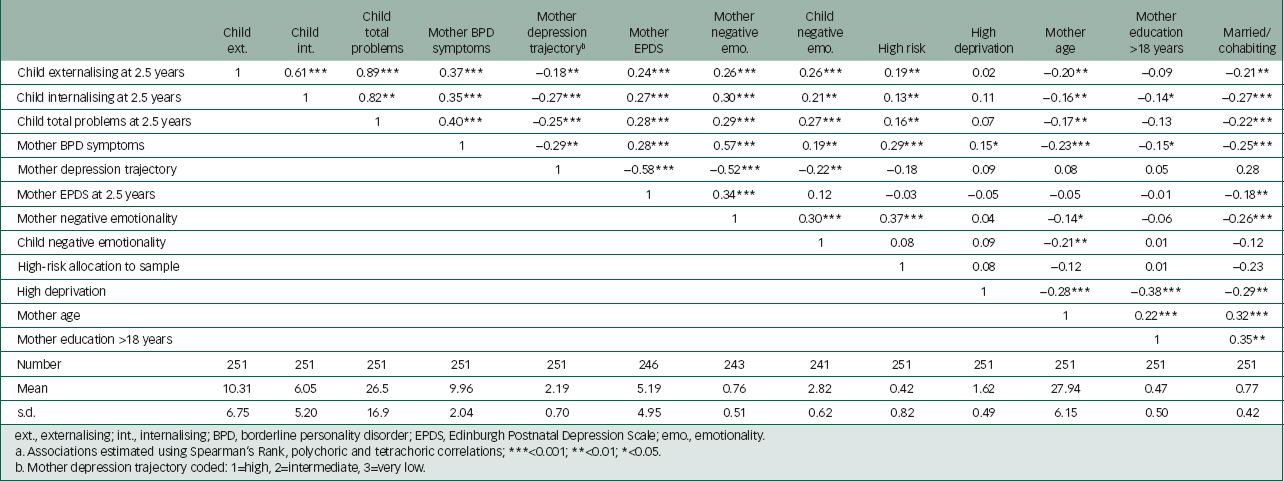 The aim of this study was to examine whether elevated maternal depressive symptoms over the first year of life predict child externalising behaviours at 2.5 years, and whether this association is explained by symptoms of BPD. Internalising and total problem scores were also examined in light of recent evidence that findings apparently specific to externalising symptoms may reflect associations with a broader set of symptoms or with general psychopathology ‘p’. Reference Caspi, Houts, Belsky, Goldman-Mellor, Harrington and Israel27
