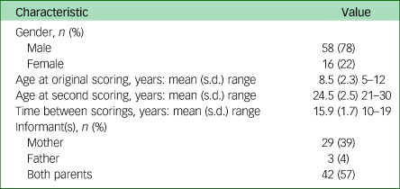The NCCA was a regional centre within the public health services, free of charge and with a catchment area that included the whole county of Värmland (population 280 000). Children were referred from school healthcare, primary care or by self-referrals through parents. Possible study participants were individuals (a) older than 5 years and younger than 13 years at time of assessment and (b) with a complete FTF present in the case report. The age range was chosen in order to minimise assessments completed during puberty and teens. A query was sent to ask for permission from the individual to contact the parent(s) for a second assessment using the FTF. After written consent was obtained, the FTF questionnaire was sent to the same parent who completed the original FTF along with an information letter. Parents were asked to answer the questionnaire in a retrospective way, i.e. to describe their offspring as he/she was as a child at the age of the original assessment. In cases of no reply, a reminder was sent 3–4 weeks later. This stepwise procedure resulted in 74 pairs of FTFs (one original, completed in childhood, and one retrospective, completed in adulthood for the same individual) (Fig. 1).