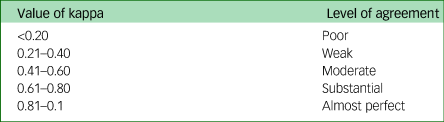 Agreement between original and retrospective scoring for each item is shown in supplementary Table 1. ‘Equal score both times’ indicates the percentage of participants with the same score both times. Agreement is presented both dichotomously (0/1–2) and for the full use of the scale (0/1/2). An overview of kappa value interpretation is shown in Table 2.Reference Landis and Koch13