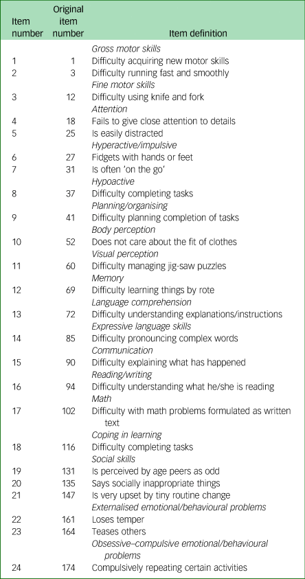 The 24 items in the FTF-Brief are representative for neurodevelopmental problems as such, cover a wide range of symptoms and importantly, frequently yield affirmative responses. Thirteen out of the 24 items were confirmed by a majority of the parents and only 2 items (item 60 ‘difficulty managing jig-saw puzzles’; item 174 ‘compulsively repeating certain activities’) were confirmed by less than a third of the parents at the original assessment. Notably, since the selected items show moderate to substantial agreement between the two assessment points, the parents are likely to remember them. In a follow-up study of ADHD symptoms in adults diagnosed with ADHD in childhood, six symptoms demonstrated high discriminating power in differentiating the individuals with ADHD from healthy controls.Reference Mannuzza, Klein, Klein, Bessler and Shrout21 Four of these items are also included in the FTF-Brief (item 18 ‘fails to give close attention to details’; item 25 ‘is easily distracted’; item 27 ‘fidgets with hands or feet’; item 31 ‘is often on the go’). Several ASD symptoms that are reported to persist into young adulthood (such as inappropriate emotional response to age peers; inappropriate quality of interaction; maintenance of sameness in routines)Reference Billstedt, Gillberg and Gillberg22 correspond nicely to three items in the FTF-Brief (item 131 ‘is perceived by age peers as odd’; item 135 ‘says socially inappropriate things’; item 147 ‘is very upset by tiny routine change’).