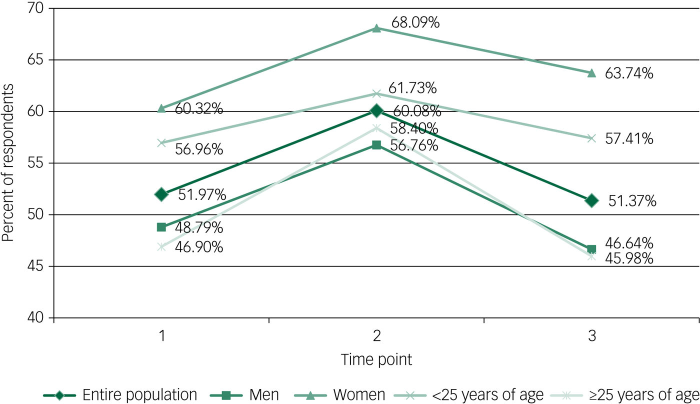 During deployment, a greater proportion of respondents screened positive for ROD (60.1 v. 52.0% at T 1 and 51.4% at T 3; P = 0.01, P = 0.01) and ROMDD (32.4 v. 27.2% at T 1 and 26.4% at T 3; P = 0.06, P = 0.07) (Fig. 1 and supplementary Fig. 1 available at https://doi.org/10.1192/bjo.2019.70). A significantly greater proportion of women and respondents under 25 years old screened positive for ROMDD and ROD than those over 25 and men.