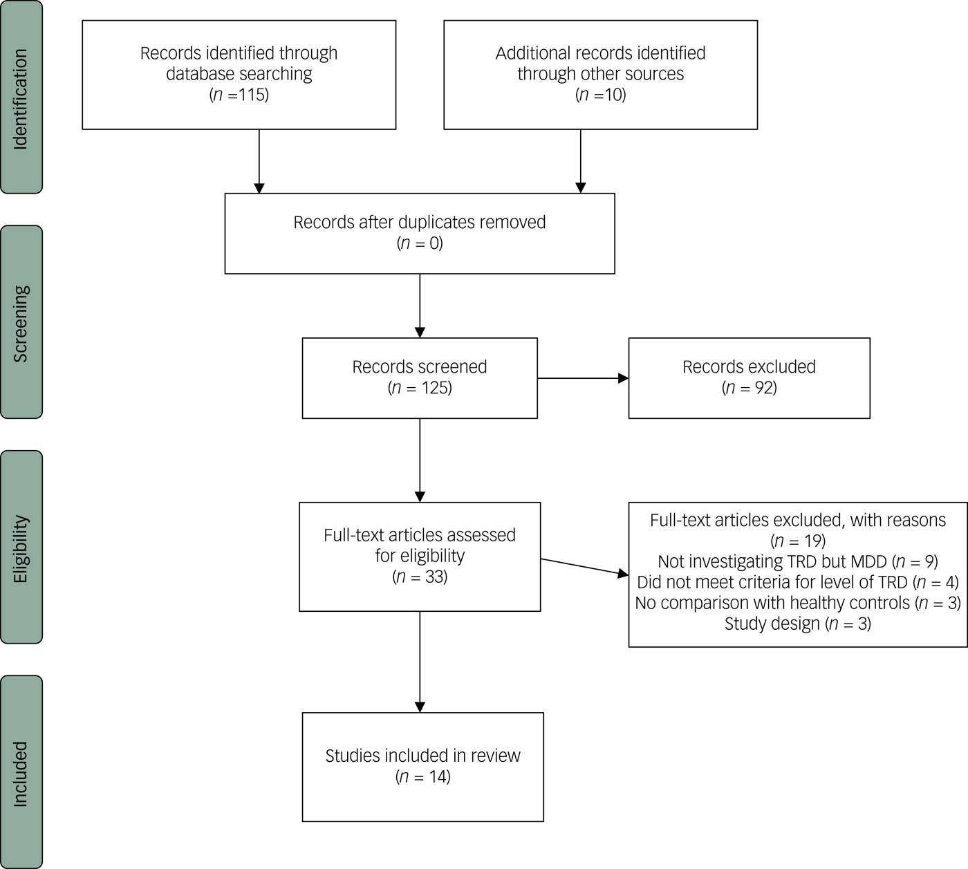 We performed a literature search in the databases of PubMed and Cochrane Library. Key words used were: “major depressive disorder”, “treatment-resistant”, “treatment-refractory” and “MRI”. This first search yielded 115 articles. Manual search with bibliographic cross-referencing yielded ten more articles. Two authors (M.P.C.K./P.v.E.) reviewed all 125 abstracts. For inclusion in this review we formulated the following criteria: number of patients ≥15; structural brain characteristics investigated using MRI. Structural imaging analyses included ROI analyses or VBM. Moreover, we included DTI or magnetisation transfer imaging (MTI) as other forms of structural imaging. Studies had to include patients with TRD, where TRD was defined by a Thase and Rush stage of ≥II (failure of at least two adequate trials of at least two distinctly different classes of antidepressant medications for at least 6 weeks);Reference Thase and Rush19 articles that did not use the Thase and Rush model were only included if they met a comparable minimal level of treatment resistance; the investigated patients were at least compared with healthy controls, but ideally to both healthy controls and patients with MDD. In total, 33 articles met inclusion criteria on the basis of the abstract and were subsequently reviewed in more detail by two authors (M.P.C.K./P.v.E.). Out of those, another 19 articles did not meet inclusion criteria and 14 articles were systematically reviewed. For an overview of the selection process see Fig. 1.