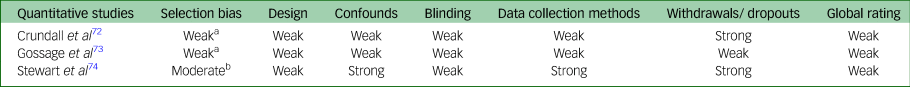 The Effective Public Health Practice Project's Quality Assessment Tool for Quantitative Studies (EPHPP;67 https://merst.ca/wp-content/uploads/2018/02/quality-assessment-tool_2010.pdf) was used to assess the methodological quality of quantitative evaluations in this review. Each article was rated against the six EPHPP components (selection bias, study design, control of confounders, blinding, data collection methods, withdrawals/dropouts), providing a global rating of either strong, moderate or weak in methodological quality. The EPHHP was developed for use in public health research. It demonstrates fair interrater agreement over individual components and excellent agreement over the final global rating.Reference Armijo-olivo, Stiles, Hagen, Biondo and Cummings68